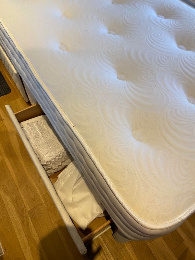 3ft x 6ft 6in. Mattress new cost £400 two great sturdy drawers.