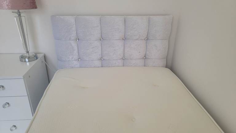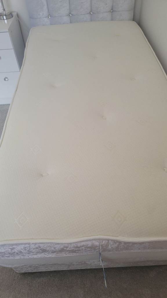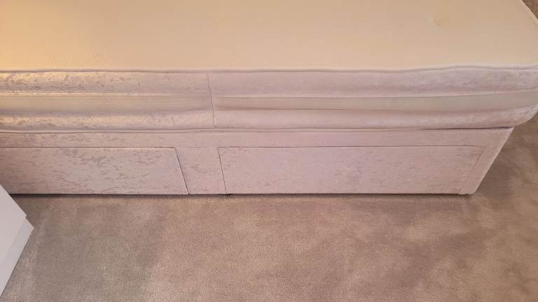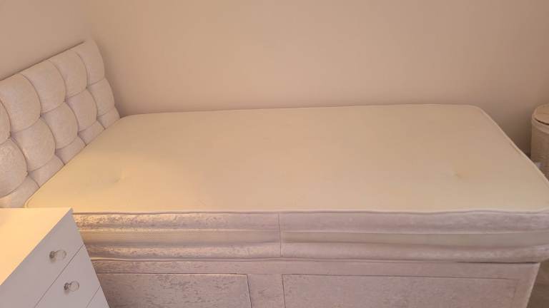 Lovely single divan, quilted headboard and mattress with 2 drawers for extra storage. The base and headboard are covered in beautiful white crushed velvet as is the surround of the mattress. The padded headboard has diamanté buttons. The headboard can be attached on either end of the bed to ensure the drawers are accessible. The mattress is coil sprung with memory foam. The bed sits on castors for easy movement. Both the divan and the mattress are in perfect as new condition.