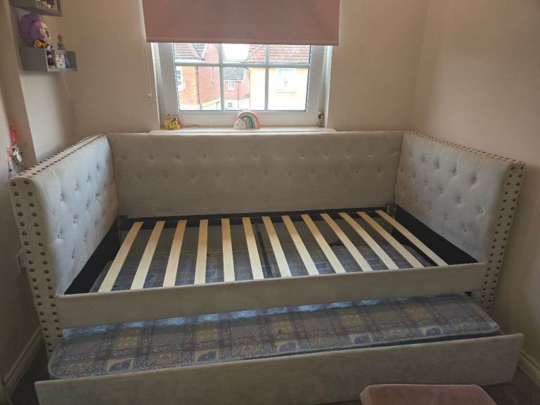 A really beautiful single day bed with a pull out trundle on wheels. Light grey in colour.