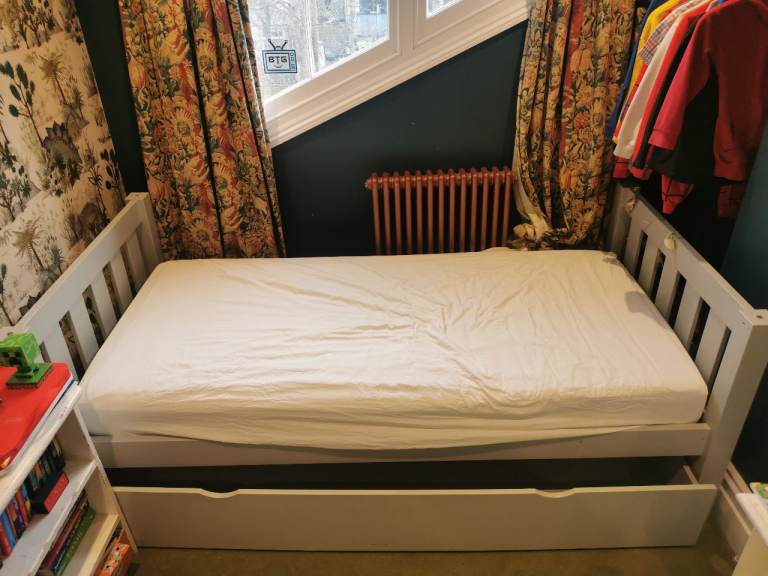Single kids bed with a pullout hat holds a mattress and can be used as an extra bed for a second kid.