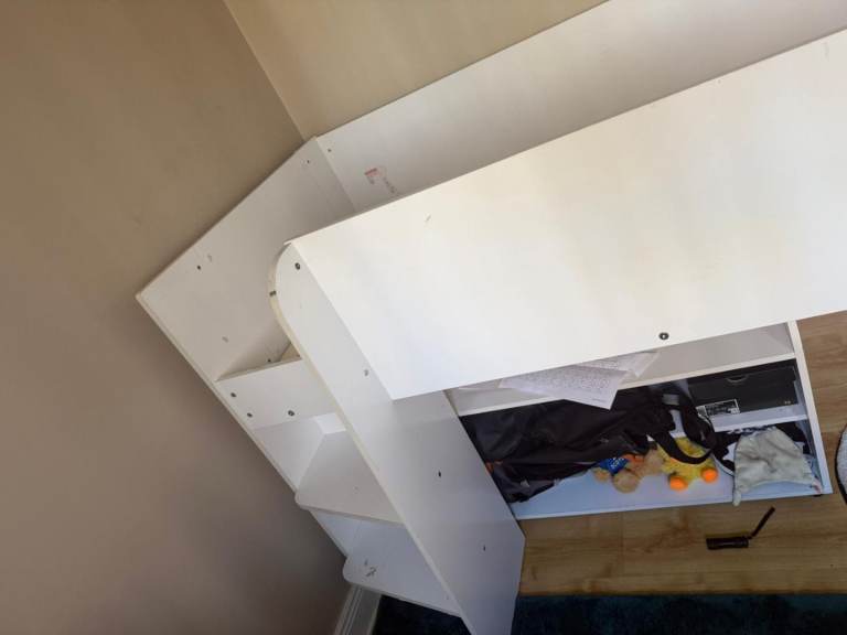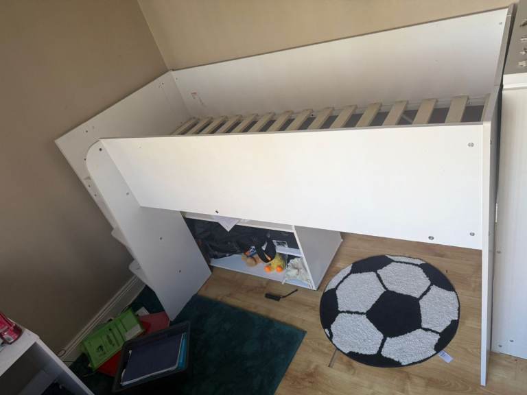 Practical and modern kids mid sleeper that will save space in any room. The sturdy frame and deep steps mean its safe for kids, there are a few scratches but otherwise great condition. This has been dismantled and ready for collection.