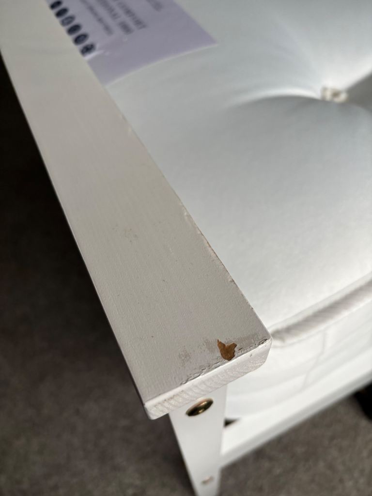Couple of chips as shown, don’t detract from the overall look of the bed.