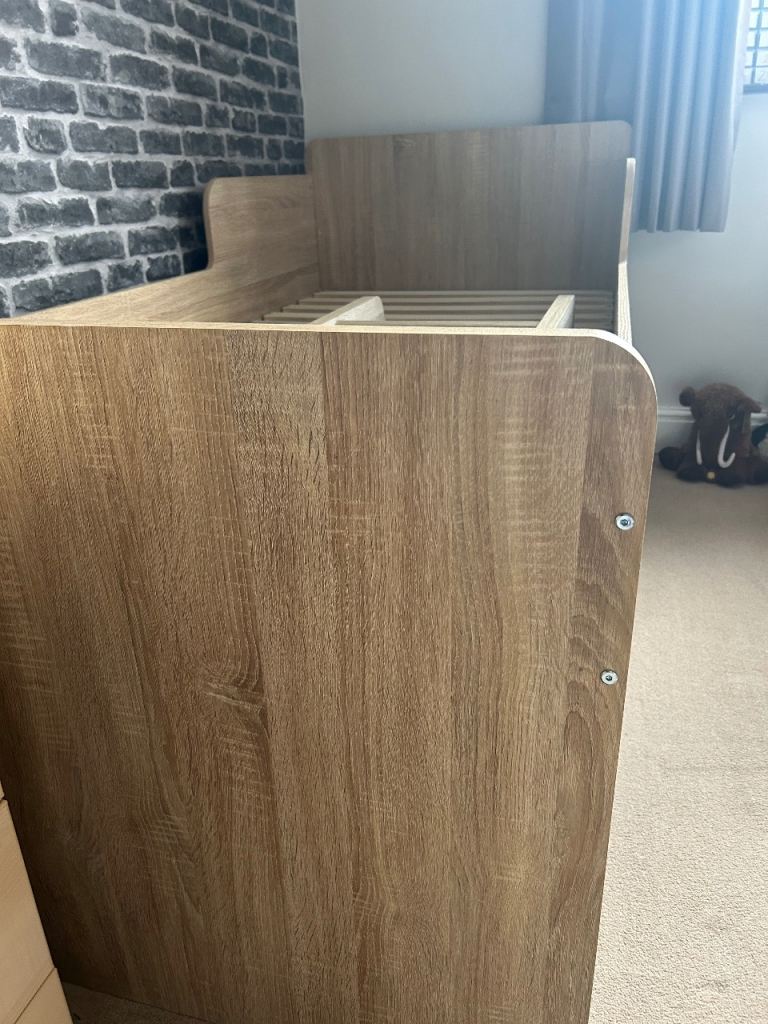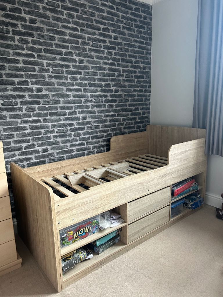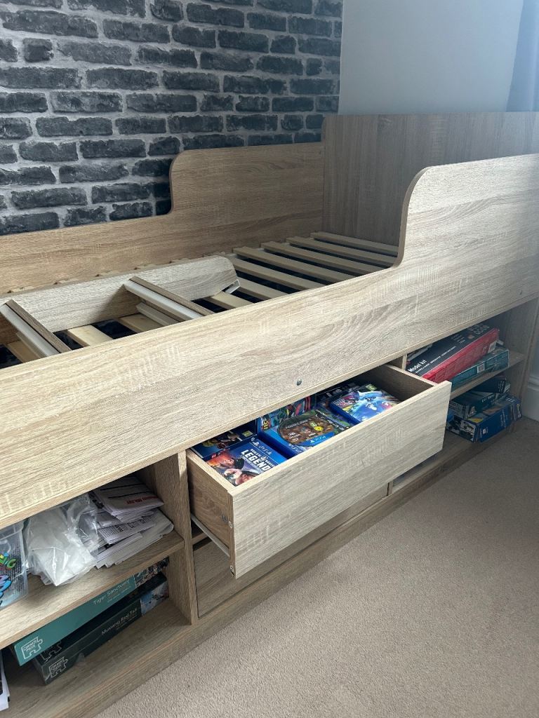 Single wooden bed with 2x draws and shelves, steps up to bed , mattress Not included.