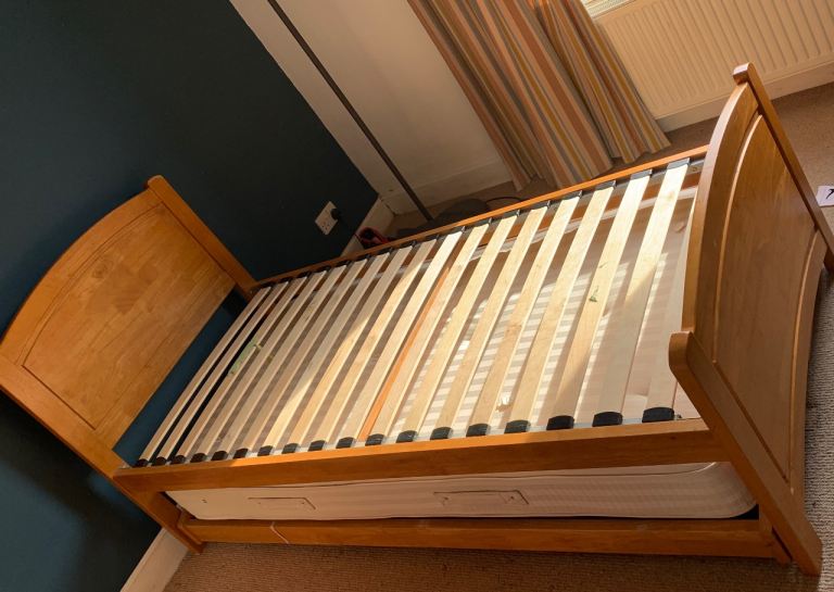 High quality Single wooden bed with additional single trundle bed beneath. Trundle bed either folds away and is stored neatly beneath, or, rolls out on wheels and folds out to be a single bed at same level as main single. Makes a large double or 2x singles.