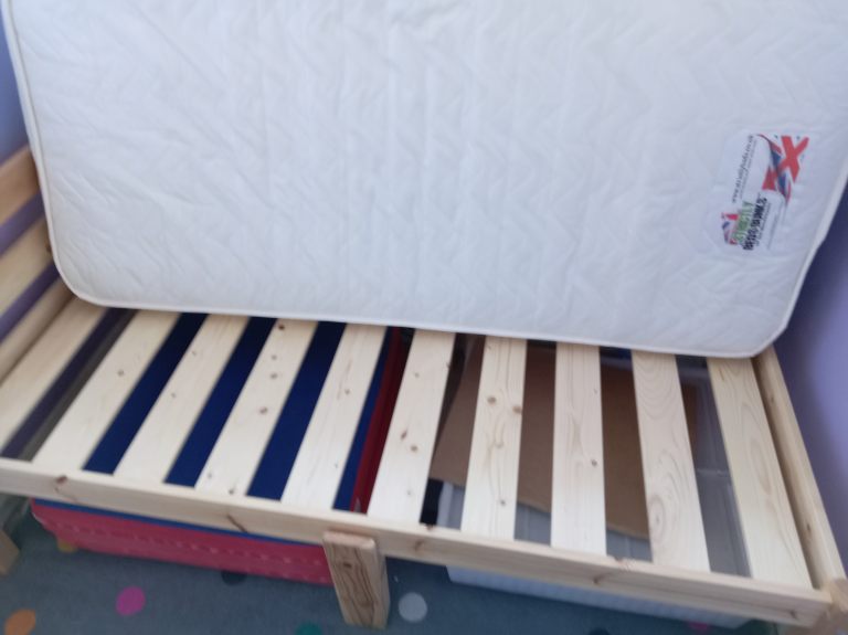 Small child's single bed. Barely slept in! Wooden frame, slatted supports.