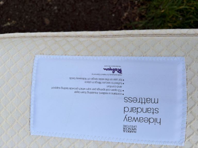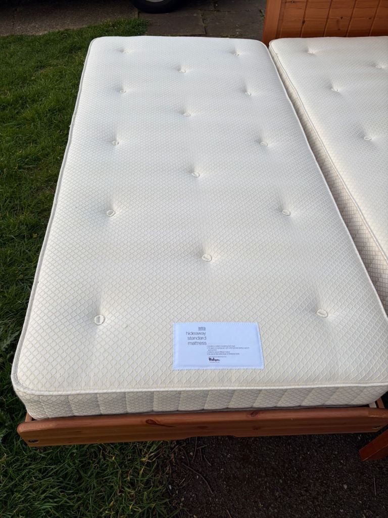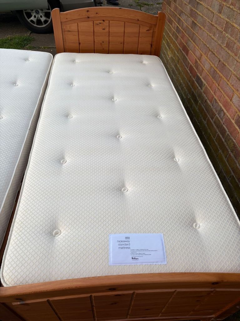 solid pine single bed that converts into a double bed, complete with two comfortable, used mattresses included free of charge. Both mattresses have attached fire labels for safety assurance. The bed frame is in good condition with only minor scratches, reflecting its sparing use in a spare room. It is currently dismantled for convenient collection. Delivery options are available at an additional cost.