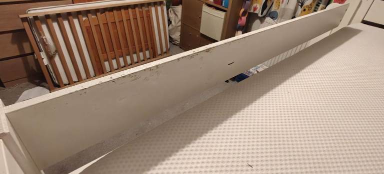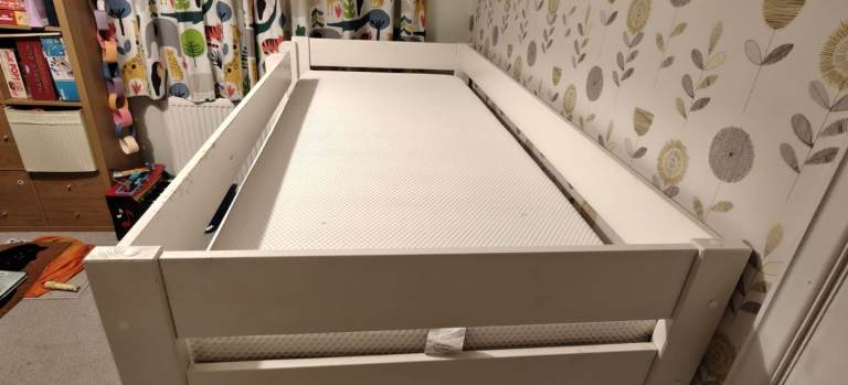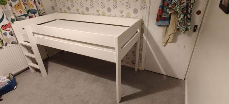 We reluctantly need to part ways with this bed as we upgraded to bunk beds. It is a lovely mid sleeper and comes with 2 storage units (not shown). This bed has been loved and well used so has some wear and tear in the paint work only. Comes with one without the mattress (cover removed and washed).