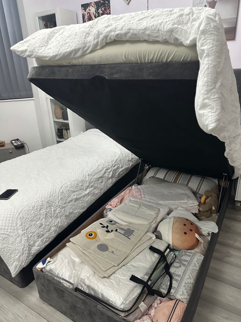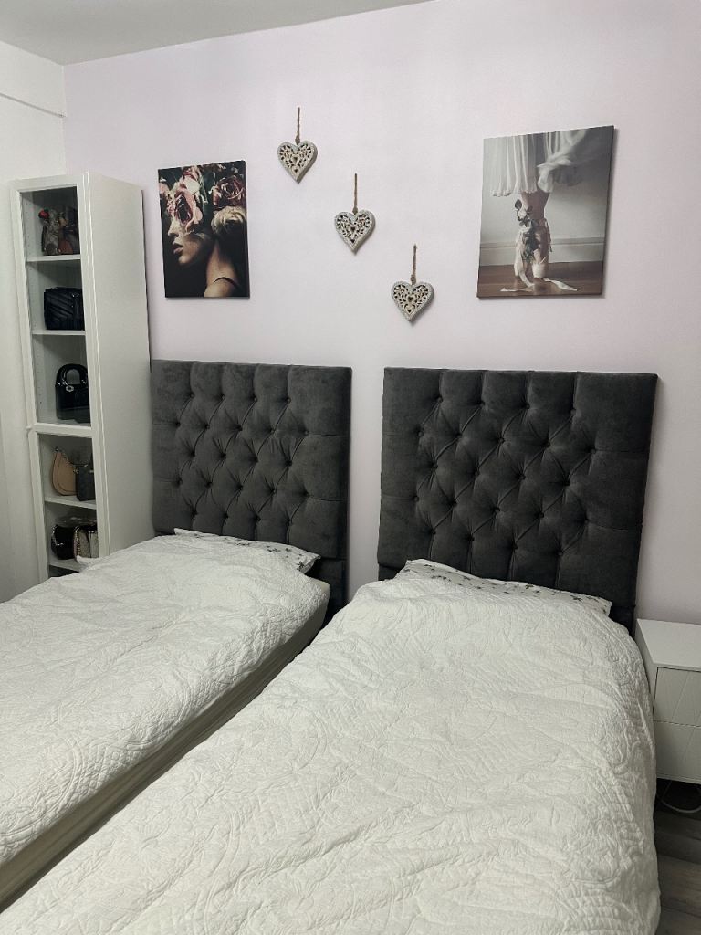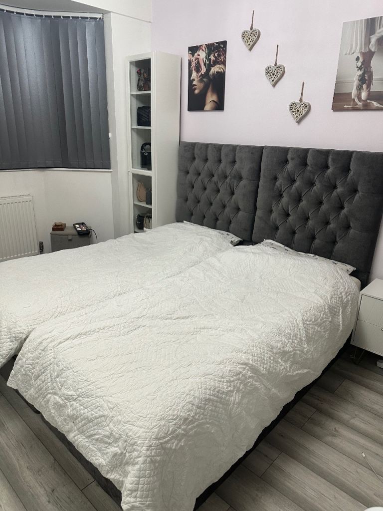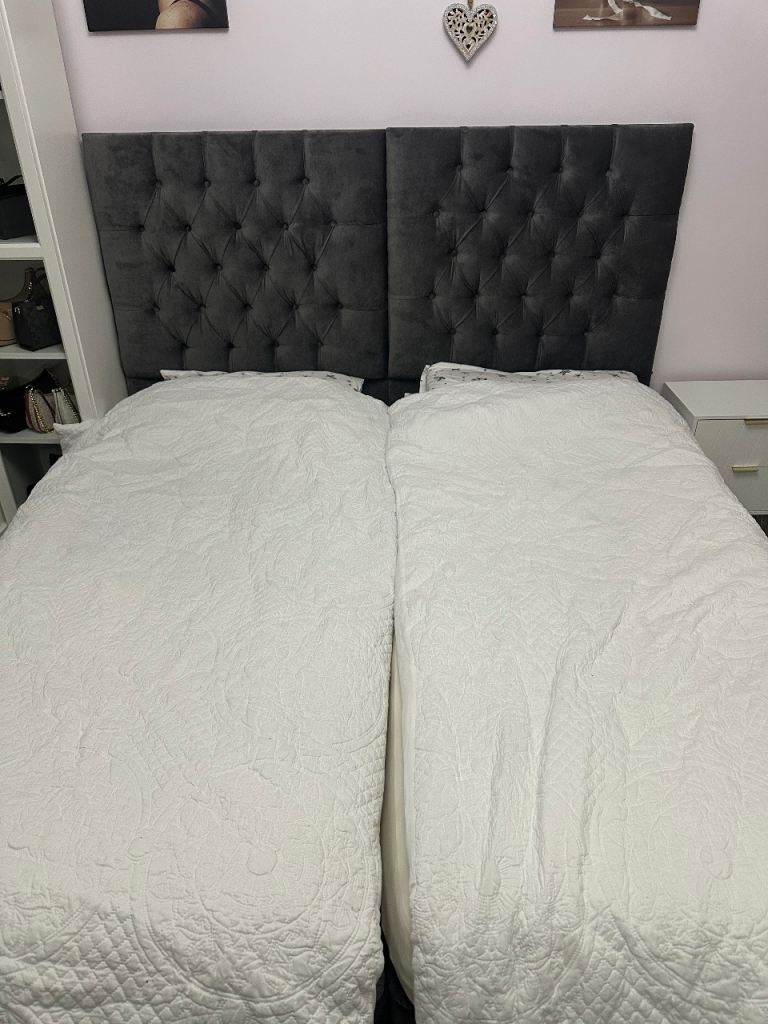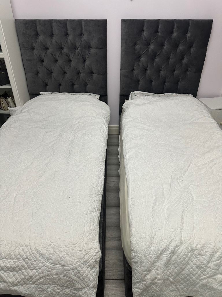 Two matching single beds in excellent condition, each featuring a stylish grey upholstered, button-tufted headboard that adds a modern and elegant touch to any bedroom. Both beds include built-in storage underneath, ideal for extra bedding or personal items.