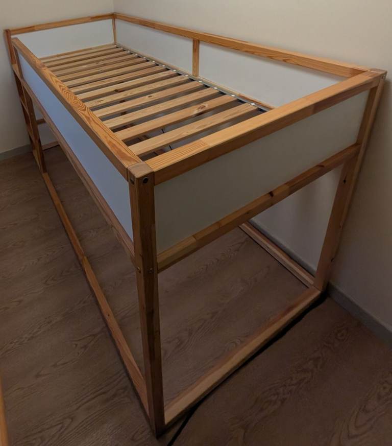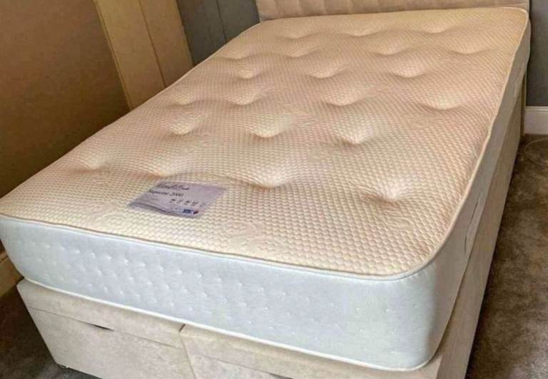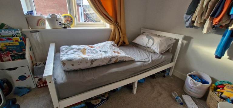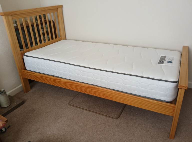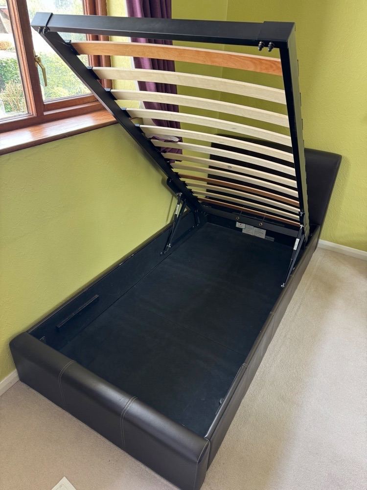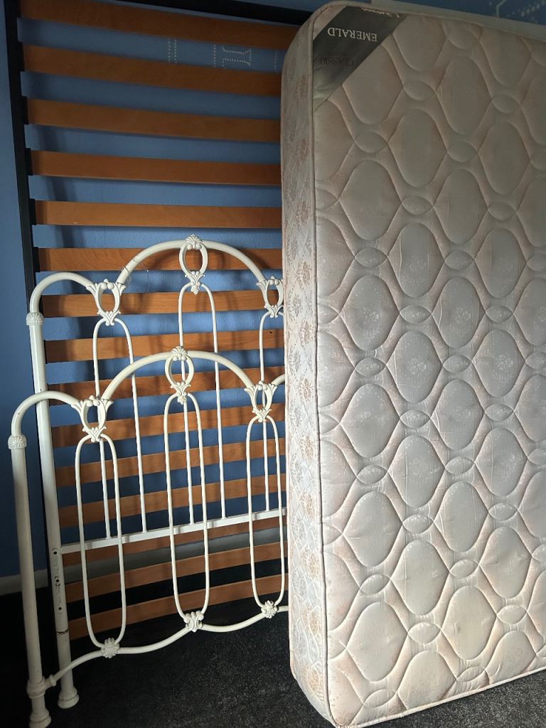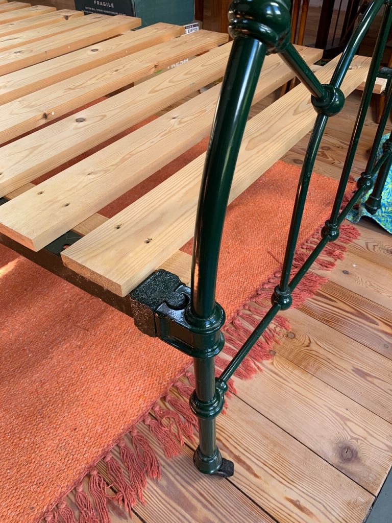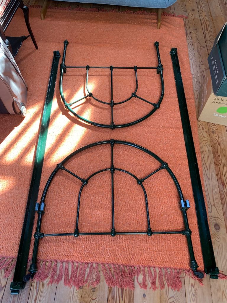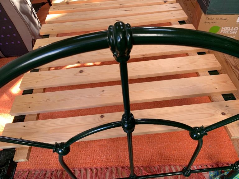 This is a single cast iron bedframe with hooped ends. British racing green colour in excellent condition. It takes a standard single mattress (not included) and is fully demountable for installation or storage.