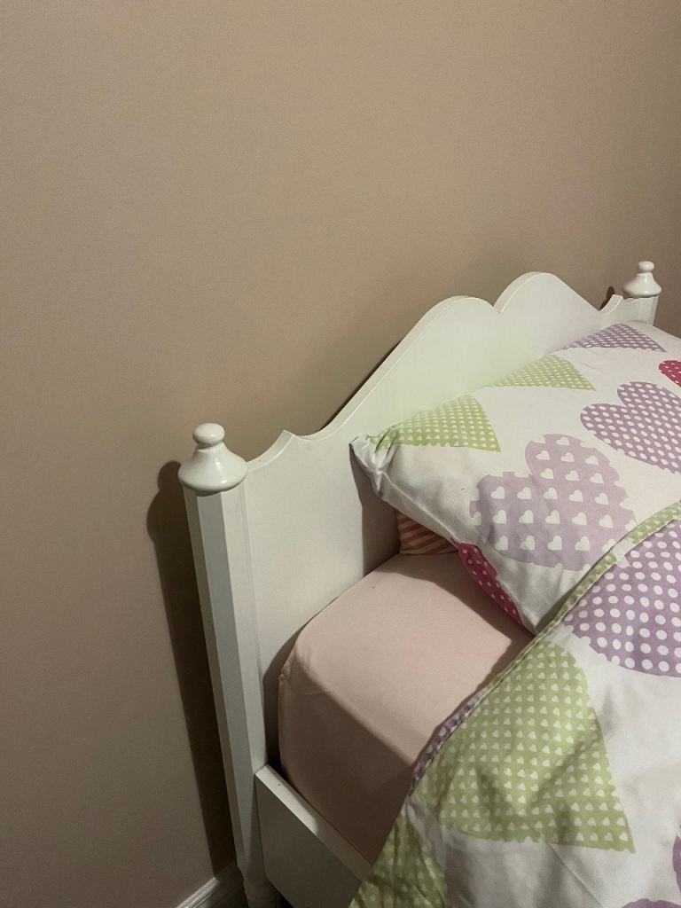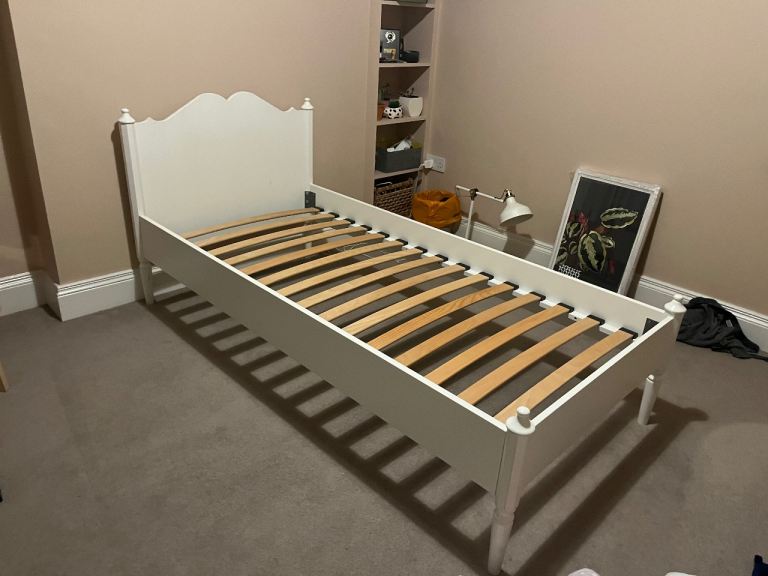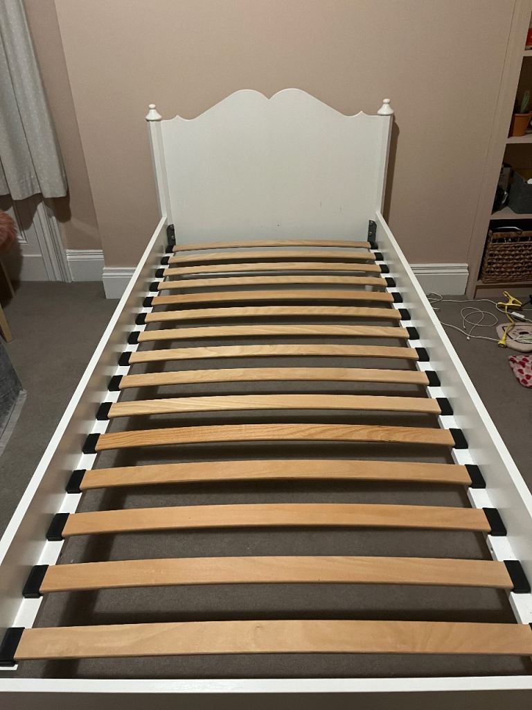 Good condition white wooden single bed frame. Has been deconstructed for easy transportation. Collection only.