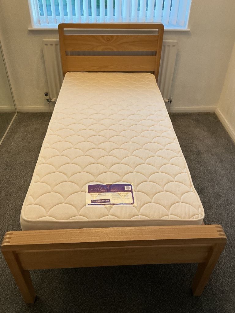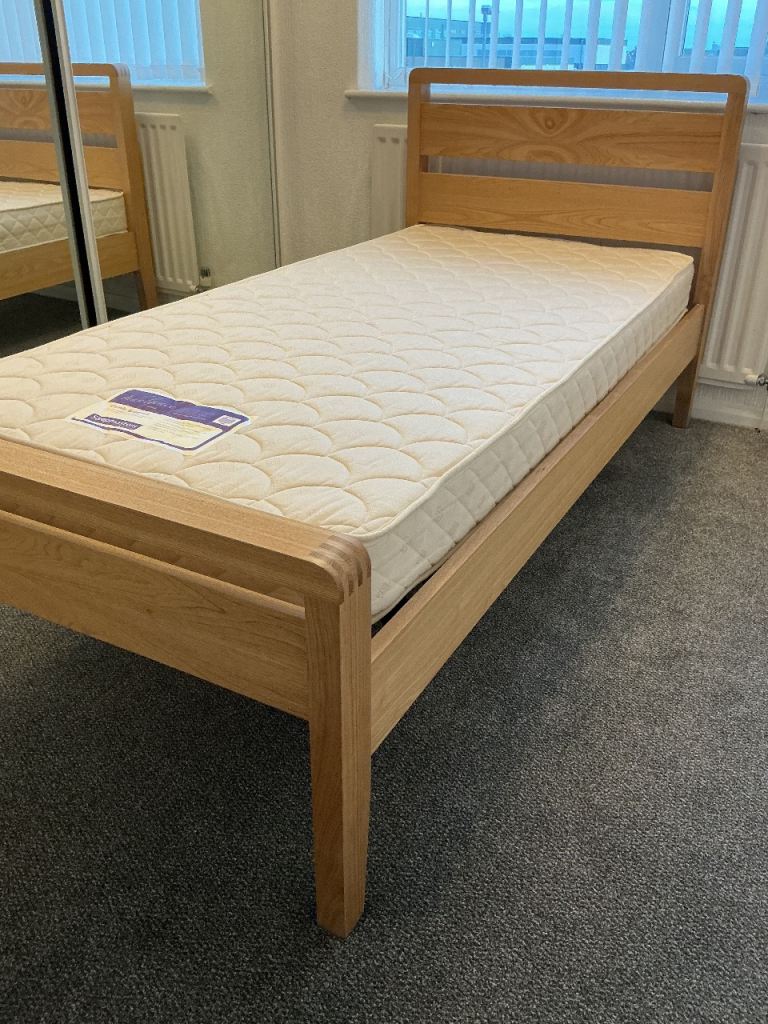 Wooden (Ash) bed from bensons for beds. As new as never used. Complete with mattress. Dismantles for transport, buyer collects. Cost was £249 at bensons for beds.