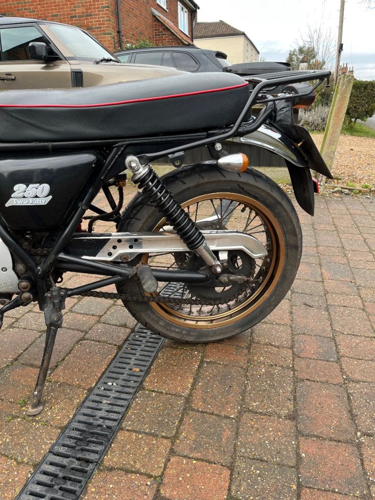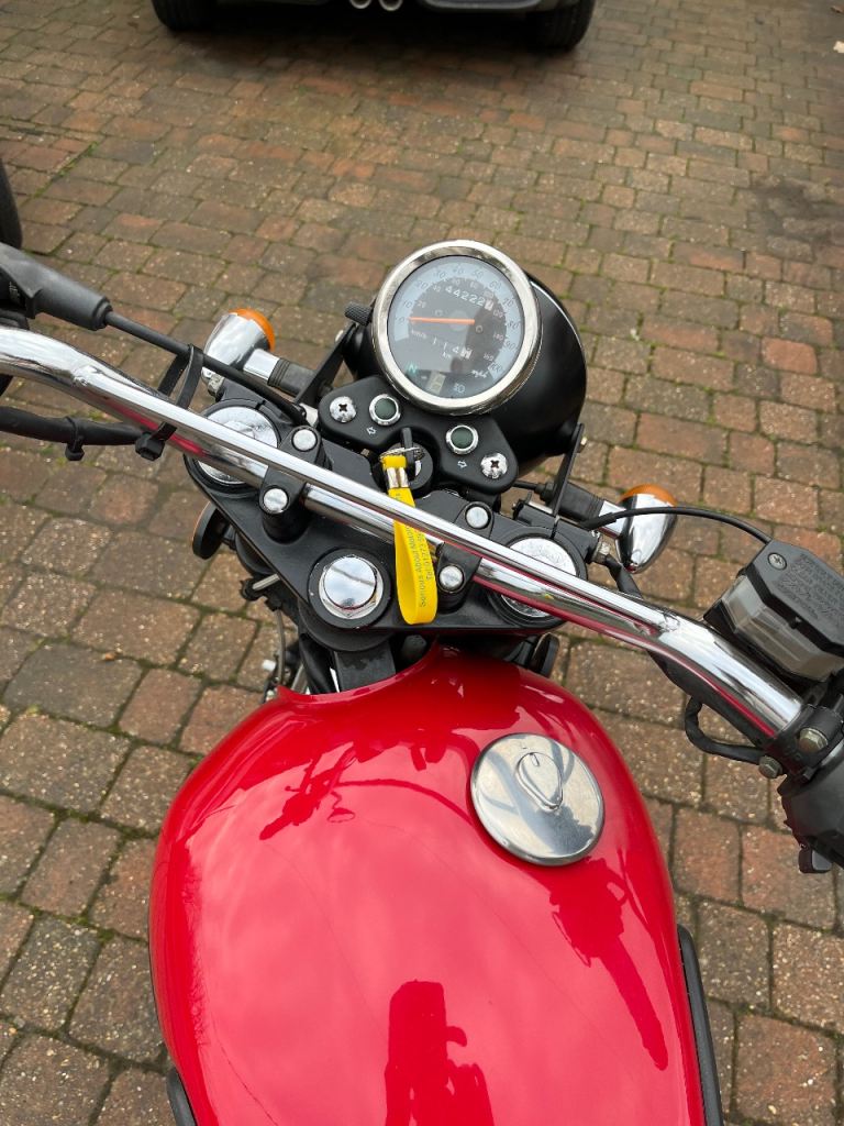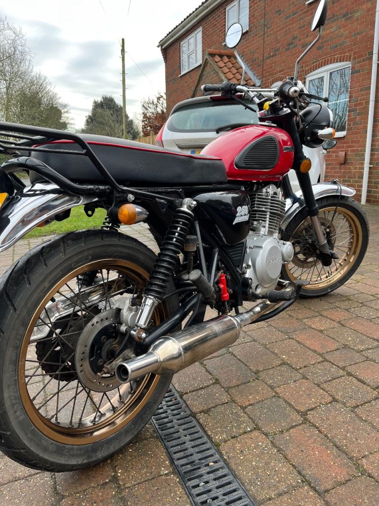 Sinnis retrostar 250 with new battery good tyres(front replaced last year) upgraded halogen headlight, comes with a rear carrier and topbox. There is a spare key and full extensive service history, the exhaust system was replaced a couple of years ago.