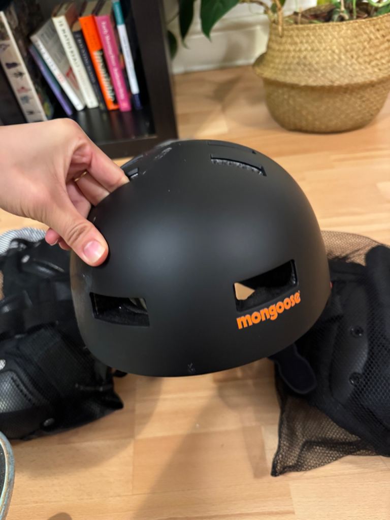 Mongoose protective helmet in good used condition. Matte black finish with ventilation openings. Shows light surface scratches from use, but no cracks or dents. Padding and straps are in good working order. Ideal for skateboarding, longboarding, BMX, or scooter riding.