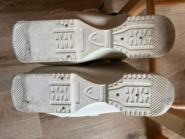 White ski race boots. Usual scuffs. Liners never moulded. Size 24 MP. (UK 5/5.5)