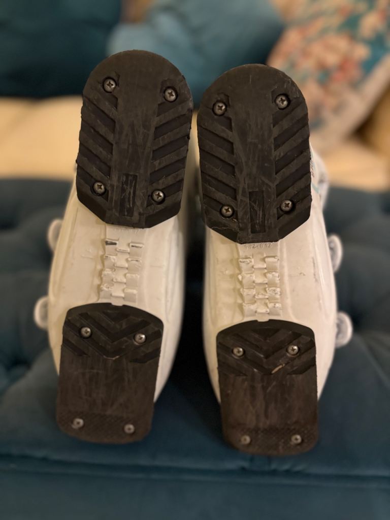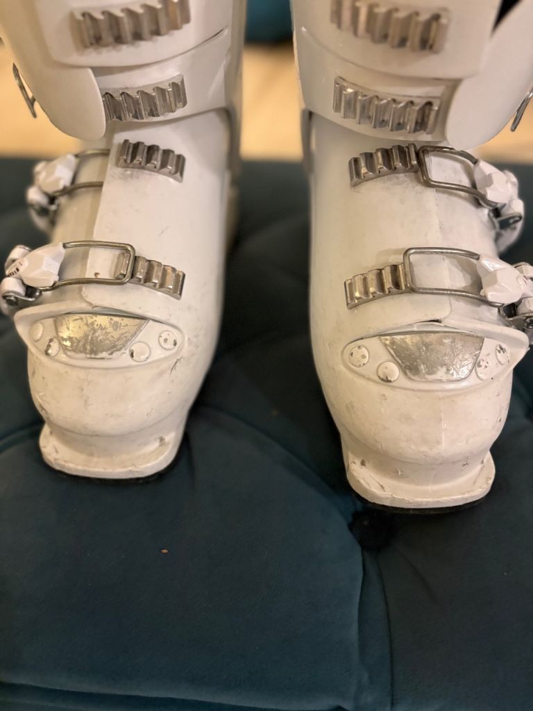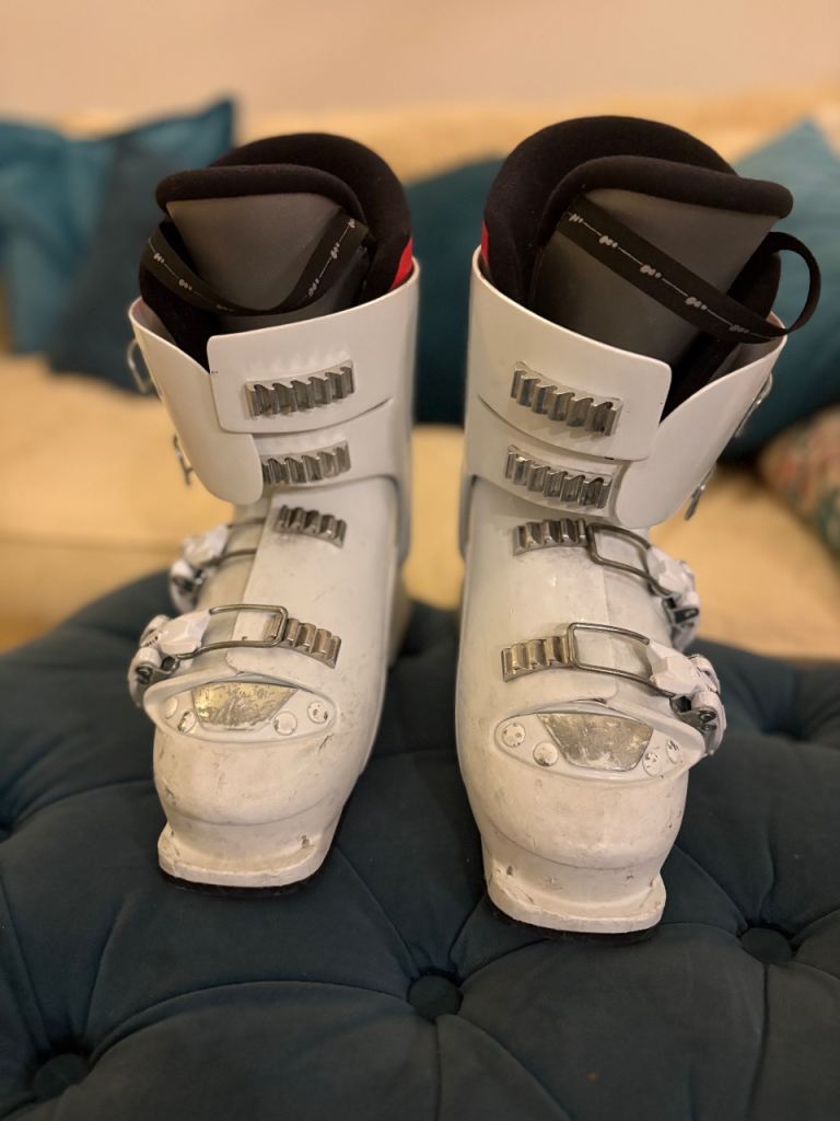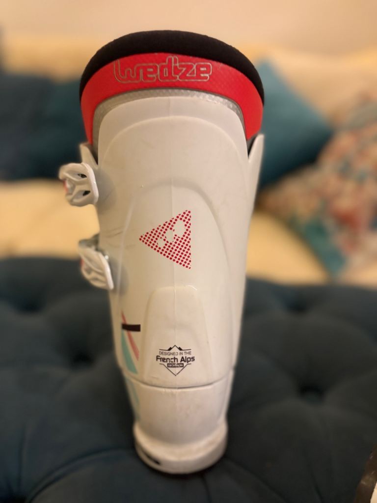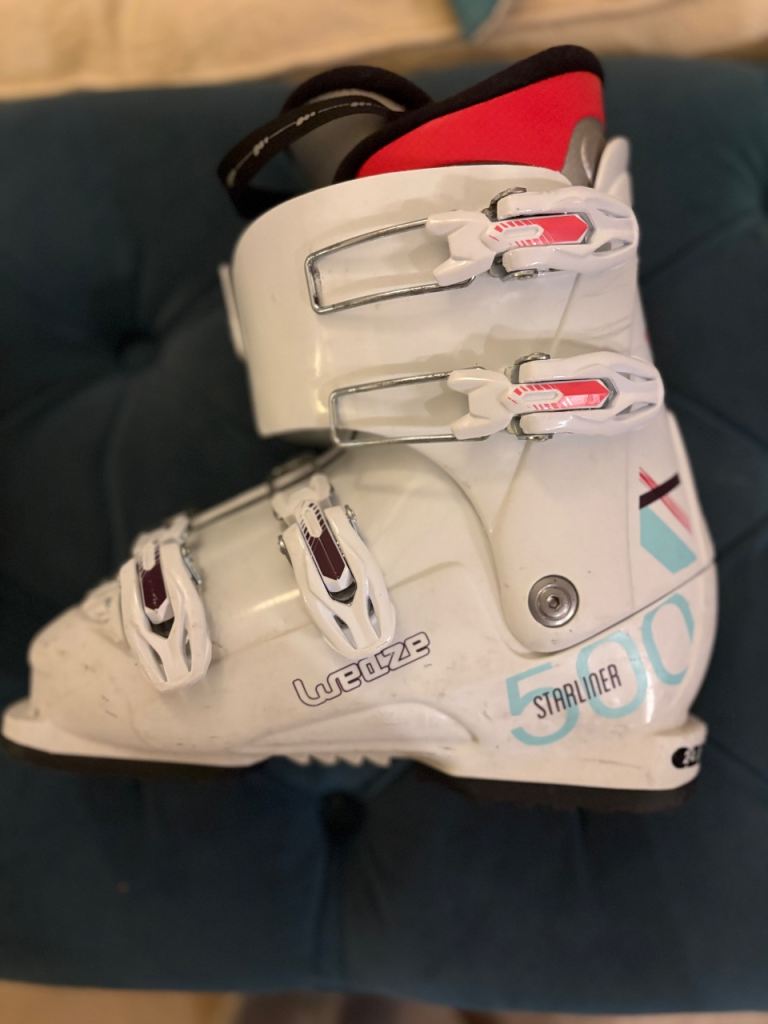 Luedze (Decathlon) Starliner 500 white ski boots with coral detailing.