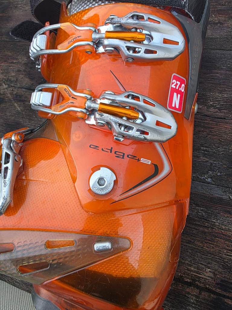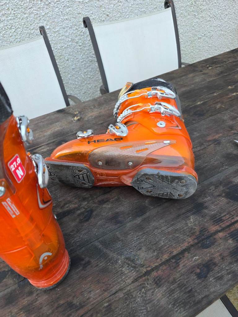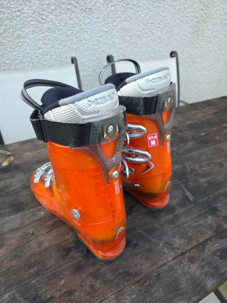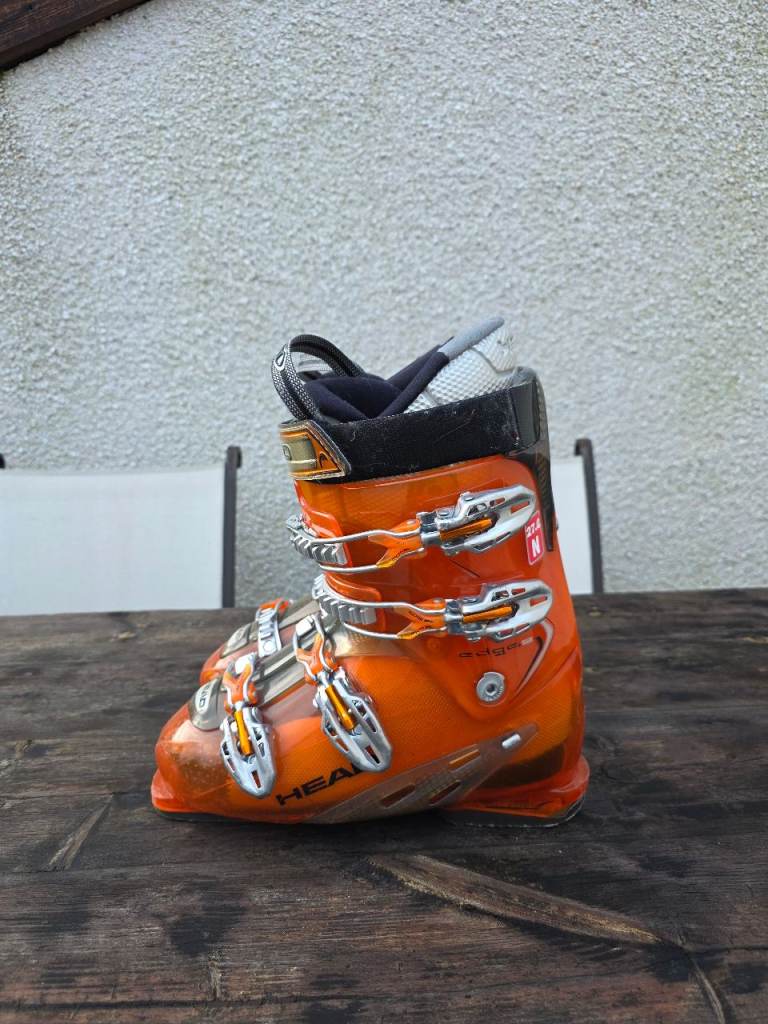 Pair of Head Edge Four Buckle Micro Adjusting Ski Boots Size UK 9 in Electric Orange.