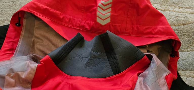 Articulated, fully adjustable hood fits comfortably with or without a helmet. Hood stows compactly when not in use.