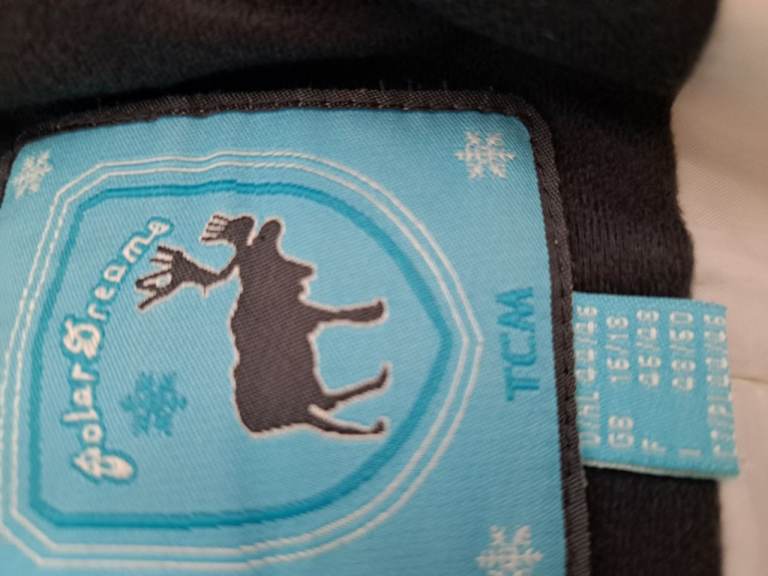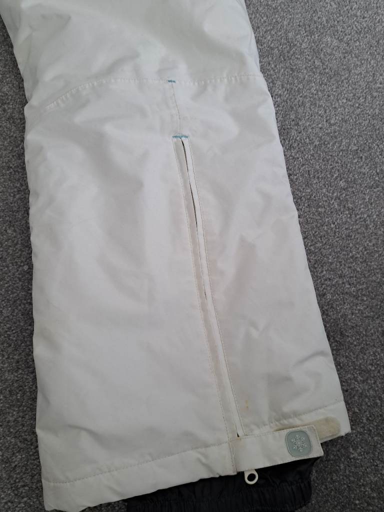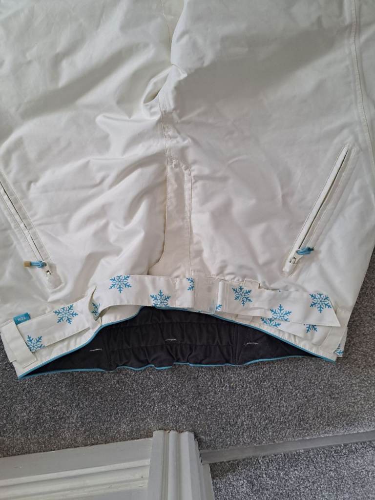 Ski trousers in cream colour, waterproof. Pretty snowflake design in blue on belt and blue edging on waist.