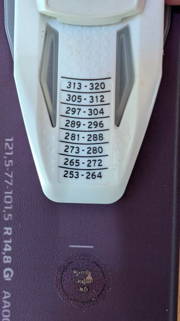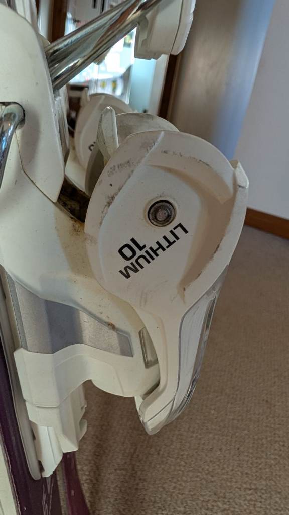 Atomic Vantage 77C with Atomic Lithium 10 bindings. Bindings can accommodate a boot lengths between 253cm and 320cm.