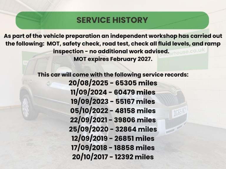 This 2015 Skoda Yeti is a very nice example of the reange, boasting a full service history and a clear vehicle history check, offering you peace of mind. There's also the added benefit of the great service history (view photos for details) along with the 1.2 petrol engine ensuring it's cheap to run and cheap to insure. As you'll see in our YouTube video, we've had a few of these Yetis recently - in this colour as well - and after driving them I can see why they're so popular! Specification highlights include DSG gearbox, parking sensors, bluetooth connectivity. This particular model comes with 12 months MOT provided on purchase and a 3 month warranty.