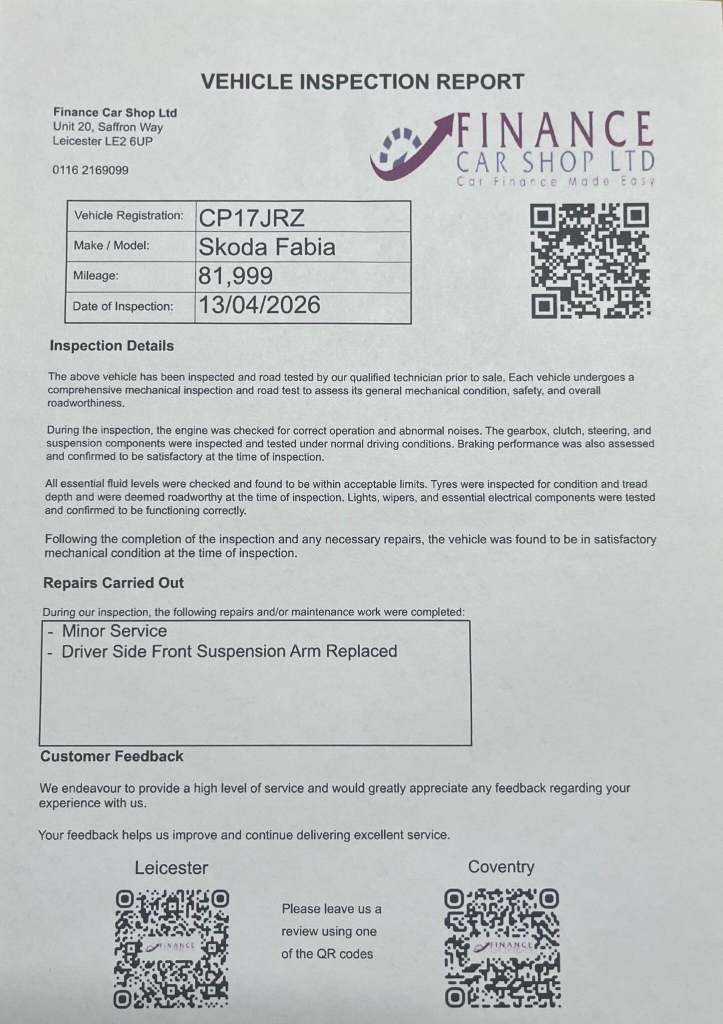 ? koda Fabia 1.2 TSI Colour Edition Euro 6 (s/s) 5dr – Stylish, Efficient & Practical HatchbackA fantastic example of the popular Skoda Fabia 1.2 TSI Colour Edition, offering excellent build quality, low running costs, and everyday practicality. Manufactured by ? koda, this hatchback is ideal for first-time drivers, commuters, or anyone seeking a reliable and economical car.Key Features:1.2 TSI petrol engine – smooth, responsive & efficientColour Edition trim – stylish exterior accents and upgraded spec5-door hatchback – practical and easy to live withEuro 6 (s/s) – ULEZ compliant Low insurance group & great fuel economyService & History:Part service history Recently serviced – ready to drive away with confidence1 former keeper – well cared for and maintainedComfort & Equipment:Air conditioningBluetooth connectivityElectric windows & mirrorsAlloy wheelsMultifunction steering wheelInfotainment system with media connectivityPractical & Spacious:The ? koda Fabia is known for its surprisingly roomy interior and generous boot space, making it perfect for shopping, commuting, and everyday family use. + 6 MONTHS WARRANTY INCLUDED + 6 MONTHS BREAKDOWN COVER + EXTENDED WARRANTY AVAILABLE + FINANCE OPTIONS AVAILABLE UPON REQUEST + DELIVERY CAN ONLY BE ARRANGED ONCE THE VEHICLE HAS BEEN VIEWED & INSPECTED IN PERSON AT OUR PREMISES + PHOTO ID IS REQUIRED FOR ALL VIEWINGS AND TEST DRIVES + WE CAN BE REACHED VIA WHATSAPP ON [Phone number removed] – FEEL FREE TO MESSAGE US + PLEASE NOTE, THE PRICE IS FIXED ON THIS VEHICLE. KINDLY BE AWARE OF THIS PRIOR TO ARRANGING A VIEWING + WE HAVE OVER 50 VEHICLES IN STOCK. AS NOT ALL VEHICLES ARE HELD ON SITE, PLEASE ENSURE YOU CALL IN ADVANCE BEFORE MAKING YOUR JOURNEY + BANK TRANSFER ONLY + MORE CARS AVAILABLE AT:WWW.FINANCECARSHOPLTD.CO.UK +
