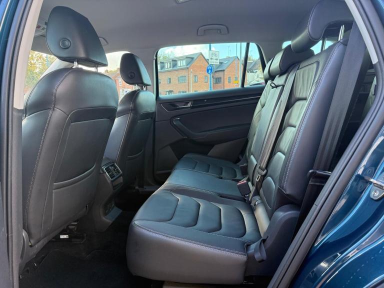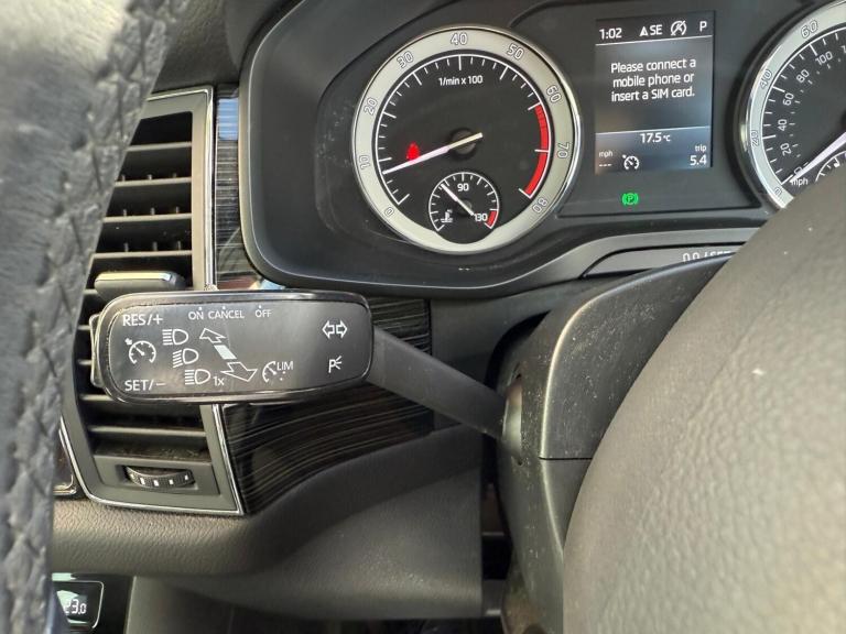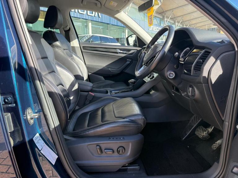 ..Bluetooth system, Colour maxi dot trip computer, Columbus satellite navigation with 9.2'' touch screen and integrated Wi-Fi, Digital voice enhancement, Drive mode selector, Exterior temperature gauge, Phone box, Power tailgate, SmartLink plus, Speed limiter, Bolero Radio, DAB Digital radio, DVD System, SD card slot, USB connection, Adaptive front lighting system, Aero wiper + intermittent function, Auto dimming door mirrors, Auto dimming rear view mirror, Automatic activation of hazard warning lights, Body colour bumpers, Body colour door mirrors and handles, Electric adjustable/heated/folding door mirrors, Electric front windows, Electric rear windows, Front and Rear door steps, Headlight washers, Heated rear window, High beam assist, High gloss black grille with chrome inserts, LED daytime running lights, LED front fog lights with static cornering light function, LED Headlights, Light assistant (coming home/tunnel light), Rain and light sensors, Rear spoiler, Rear wiper, Silver roof rails, Sunset privacy glass, Tinted windows, 12V Accessory socket in centre console, 12V power point in luggage area, 3 rear height adjustable headrests, 4 lashing points on luggage floor, 60/40 split fold rear seat back, Boot storage compartments, Centre console with storage/cupholders, Chrome gear shift lever, Chrome inner door handles, Driver's glovebox with lid, Driver's storage box, Electrically adjustable front seats with lumbar support and memory settings, Folding grab handles with rear coat hooks, Front and rear bottle holders, Front centre armrest with storage compartment, Front/rear courtesy lights, Height adjustable front seats, Height/tilt adjustable front headrests, Illuminated air conditioned glovebox, Illuminated luggage compartment, Isofix system on outer rear seats, Leather upholstery, Luggage compartment cover, Luggage nets in boot, Manually adjustable steering column, Passenger side net compartment on centre console, Pollen filter, Rear centre armrest with cupholders, Removable LED light in boot, Sunglasses storage, Sunvisors with illuminated vanity mirrors, Ticket holder, Chrome pack - Kodiaq, 3 point front/outer rear seatbelts+pre-tensioners, ABS + EDL + ASR + MSR + ESC, Automatic unlocking of doors in case of impact, Driver and passenger airbags, Drivers knee airbag, Electromechanical parking brake, Front assist including city emergency braking, Front side airbags, Fuel cut off safety device, Head airbags, Hill hold control, Hydraulic Brake Assist