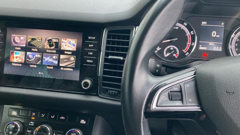 The 2019 Škoda Kodiaq Estate 1.5 TSI SE 5-door DSG emerges as a compelling choice for families seeking a spacious, well-rounded SUV that doesn’t skimp on practicality or everyday usability: its 1.5-litre turbo-charged petrol engine teamed with a smooth seven-speed DSG automatic produces around 150 PS (with a 0–62 mph of roughly 9.7–9.8 s) and returns sensible economy in real-world use, offering an agreeable blend of punch and frugality for a large SUV.Inside, the Kodiaq’s cabin boasts generous space — especially in the five-seat version — with plenty of headroom and a thoughtfully designed interior that cleverly uses storage and offers flexible luggage capacity, making it ideal for school runs, weekend trips or daily errands.The SE trim packs in a raft of useful everyday features, including LED lighting, comfort-enhancing equipment and safety tech such as autonomous emergency braking and blind-spot detection, keeping occupants comfortable and secure on both urban and motorway drives.All told, the Kodiaq SE blends broad-shouldered practicality with composed driving manners and a well-equipped cabin, underpinning its appeal as a versatile SUV for modern family life..Air Conditioning, Metallic Paint, Alloy Wheels, DAB Radio, Bluetooth, Parking Sensors, USB, Manufacturer Approved& Apple-Android Play, Electric front windows, Electromechanical parking brake, Bluetooth system, Speed limiter, ECO Stop/start function, Exterior temperature gauge, Auto dimming rear view mirror, Anthrazit Light Brushed dash inserts, USB Connection, Rear spoiler, Front fog lights, Pollen filter, Driver's storage box, Front courtesy lights, Driver and passenger airbags, Height adjustable front seats, Immobiliser