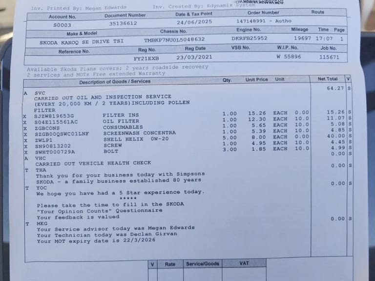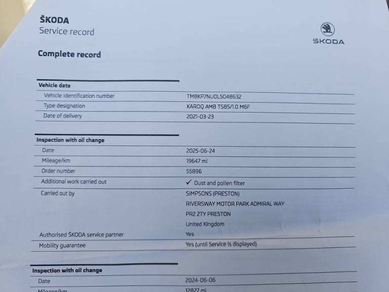 This 2021 Skoda Karoq TSI SE Drive presents an exceptional ownership proposition with its remarkably low mileage of just 25,143 miles, a clear vehicle history check, and an MOT valid until March 2027. This Euro 6 compliant 1.0 litre petrol model, in the SE Drive trim, offers a host of convenient features designed to enhance your driving experience. These include Automatic Headlight Control, a helpful Rear View Camera for easier parking, and SmartLink Plus compatibility, which seamlessly integrates your Android Auto or Apple CarPlay devices. The cabin is kept comfortable with Dual Zone Climate Control, and the Light and Rain Sensor, along with an auto dimming rear view mirror, adds to the overall ease of use. The Skoda Karoq TSI SE Drive stands out with its impressive fuel economy of 46 mpg, demonstrating its efficiency compared to other vehicles in its class. Furthermore, its low CO2 emissions and low insurance group highlight its cost effectiveness for everyday driving. This combination of low mileage, comprehensive MOT, desirable features, and excellent running costs makes this Karoq a sensible and appealing choice..12V Power Socket in Boot, 17in Alloy Wheels - Aero, 2 Reading Lights Front - For Driver and Passenger, 2-Spoke Leather Multifunction Steering Wheel, 4 Foldable Roof Handles with Clothes Hooks in Rear, Aero Front Windscreen Wipers with Intermitted Function, Air Conditioning - Climate Control Dual Zone, Airbags - Driver, Alarm with Interior Monitoring - Back Up Horn - Tilt Sensor and SAFE Function, Amundsen Touchscreen Satellite Navigation System, Anti-Theft Locking Wheel Bolts, Automatic Door Unlocking Incase of Crash, Automatic Fuel Cut Off Incase of Crash, Automatic Headlight Control, Black Roof Rails, Body Coloured Door Mirrors and Door Handles, Bolero Radio, Boot Package - 2 Folding Hooks and Nets, Bottle Holders in Door Panel in the Front - 1.5 Litre Bottle - Driver and Passenger Door Panels, Care Connect - Remote Access - 1 Year, Care Connect - eCall, Cargo Element in Boot, Chrome Framed Air Vents, Chrome Interior Door Handles, Colour Multifunction Trip Computer, Cruise Control with Speed Limiter, DAB Digital Radio and Bluetooth, Door Step in Front with KAROQ Badging, Driver Fatigue Sensor, ESC Electronic Stability Control incl ABS Anti Lock Braking System, Electric Front and Rear Windows with Child Proof Lock, Electric Window Control Buttons in Black, Electrically Adjustable - Heated - Folding - Auto-Dimming Door Mirrors, Electronic Engine Immobiliser, Electronic Parking Brake with Auto Hold Function, Emergency Rear Braking Signal, Foldable Hooks in the Boot, Folding Tables on Front Seat Backrests, Front - Head - Knee - Curtain - Front Side Airbags, Front Assist Radar, Front Centre Armrest with Storage Compartment - Rear Air Vents and 12v Socket, Front Fog Lights, Glasses Storage Compartment, Glovebox - Illuminated and Cooled, Halogen Headlights with LED Daytime Running Lights, Heated Rear Windscreen, Height Adjustable Driver and Front Passenger Seat, Height Adjustable Front Three-Point Seat Belts with Tensioners, ISOFIX Child Seat Preparation - Outer Rear, Ice Scraper, Illumination of Luggage Compartment, Keyless Start-Stop with SAFE System, LED Interior Light Package and SKODA Welcome Light, Light Assistant, Light and Rain Sensor with Auto-Dimming Rear View Mirror, Manual Lumbar Support for Front Seats, Net Programme in Boot, Non Smokers Package, Parking Sensors - Front and Rear, Passenger Airbag with Switch Off Function, Pedestrian Monitor, Pen Holder, Pollen Filter, Power Steering, Privacy Glass, Reading Lights - Rear, Rear Boot Cover, Rear Light