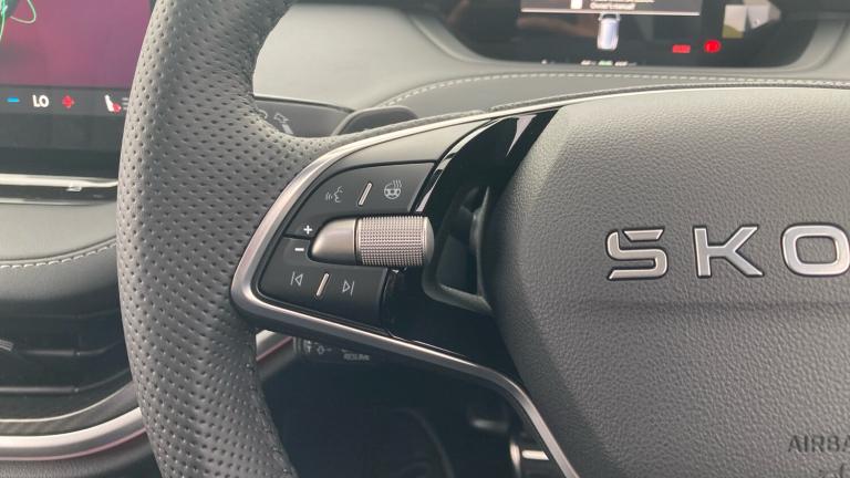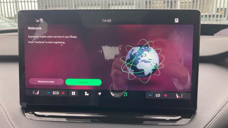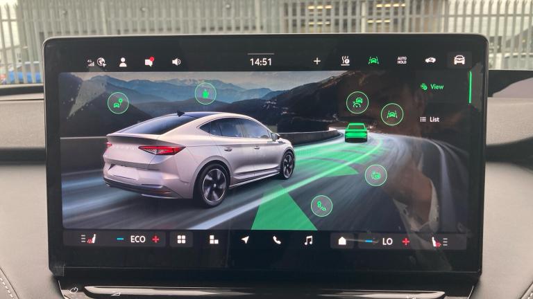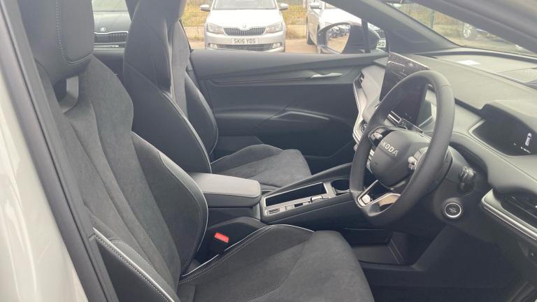 .Black textile floor mats with grey stitching, 135 kW DC charging, Variable front intermittent wipers, Rain and light sensors, Heat insulating darkened glass in side and rear windows, Electric front and rear windows, Heat insulating glass in windshield, Privacy glass and acoustic side windows, Rear wiper, Front disc brakes, Rear drum brakes, ESC (incl. ABS+MSR+ASR+EDS+HBA+DSR+RBS+MKB), Sports suspension, Voice control system, Bluetooth system, E-call, Speed limiter, Front and rear parking sensors, Drive Mode Selector, Driver alert system, Traffic sign recognition, Blind Spot Detection (BAS), Electronic engine sound, Skoda Connect iV remote services with charging, air conditioning and smart schedules, Speed assist, Predictive adaptive cruise control with traffic jam assist, Front assist with assisted automatic braking to vehicles, pedestrians and cyclists, Electrically operated tailgate with kick activation (virtual pedal)