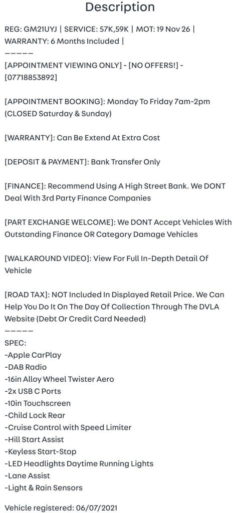 REG: GM21UYJ SERVICE: 57K,59K MOT: 19 Nov 26 WARRANTY: 6 Months Included [APPOINTMENT VIEWING ONLY] - [NO OFFERS!] - [07718853892] [APPOINTMENT BOOKING]: Monday To Friday 7am-2pm (CLOSED Saturday & Sunday) [WARRANTY]: Can Be Extend At Extra Cost [DEPOSIT & PAYMENT]: Bank Transfer Only [FINANCE]: Recommend Using A High Street Bank. We DONT Deal With 3rd Party Finance Companies [PART EXCHANGE WELCOME]: We DONT Accept Vehicles With Outstanding Finance OR Category Damage Vehicles [WALKAROUND VIDEO]: View For Full In-Depth Detail Of Vehicle [ROAD TAX]: NOT Included In Displayed Retail Price. We Can Help You Do It On The Day Of Collection Through The DVLA Website (Debt Or Credit Card Needed) SPEC: -Apple CarPlay -DAB Radio -16in Alloy Wheel Twister Aero -2x USB C Ports -10in Touchscreen -Child Lock Rear -Cruise Control with Speed Limiter -Hill Start Assist -Keyless Start-Stop -LED Headlights Daytime Running Lights -Lane Assist -Light & Rain Sensors