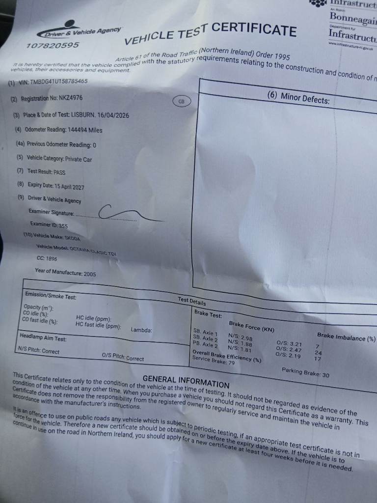 SKODA OCTAVIA 1.9 TDI DIESEL ENGINE 2005 FULL YEAR'S MOT CERTIFICATE TODAY 💥