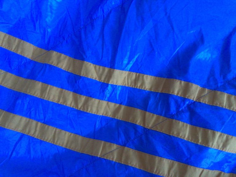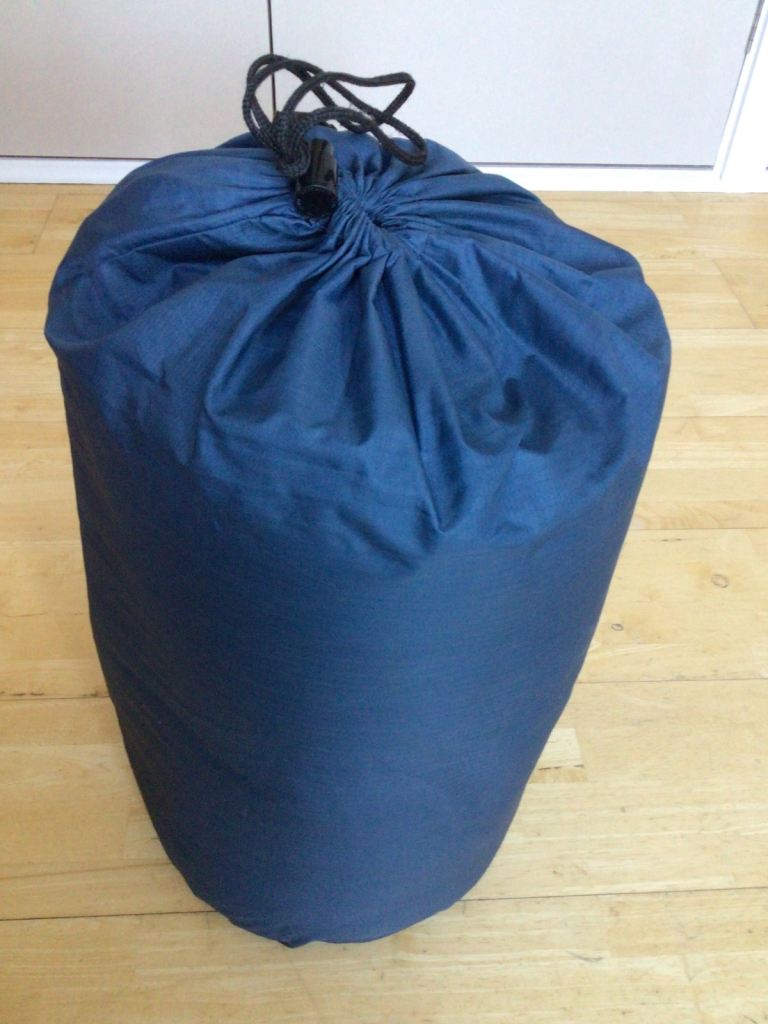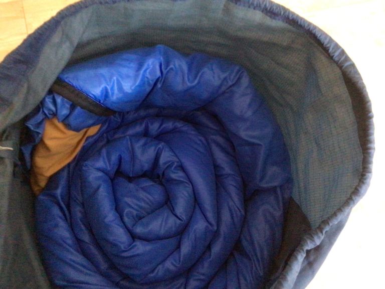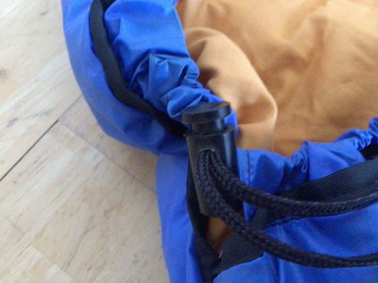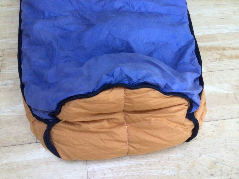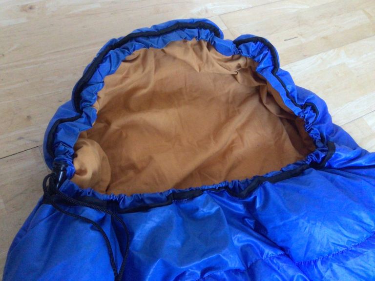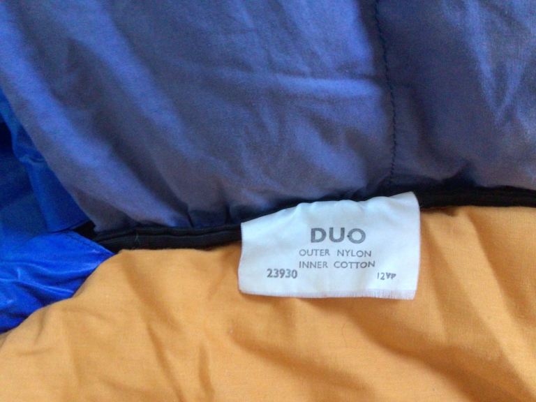 Clever design as the section you lie on (inner orange) is synthetic filled and the upper layer (inner blue) is down filled. Very very warm and cosy. Cotton lining. Water repellent outer cover. Mummy shape with drawstring around the top/hood.