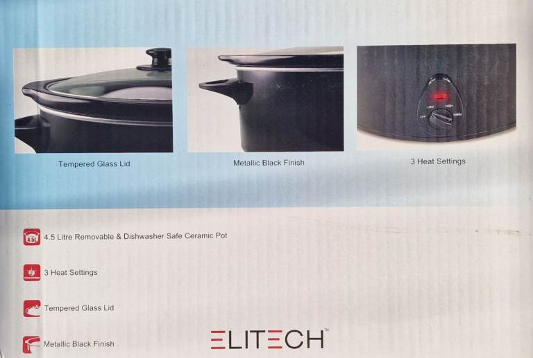 Elitech 4.5 ltr slow cooker. Brand new. Never used. Boxed and in original packing. See photos. Unwanted as duplicated Christmas present. Full instructions included. Black so will suit any kitchen colour. Could drop off local, Wolves, Black Country if required