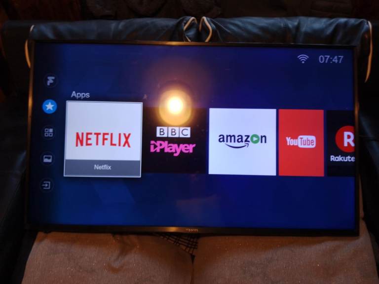 In good working condition, has Netflix, prime video, YouTube, Rakuten TV, screen mirror, internet browser installed. However, only Netflix doesn't work but can be resolved by getting a fire stick and plugging it into the TV's hami port, everything else works fine.