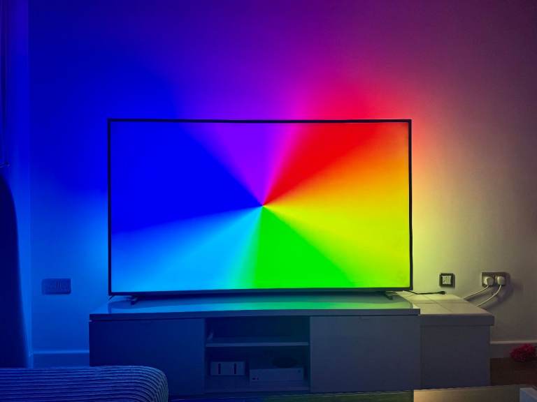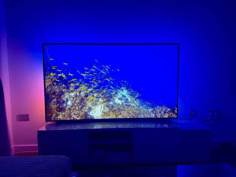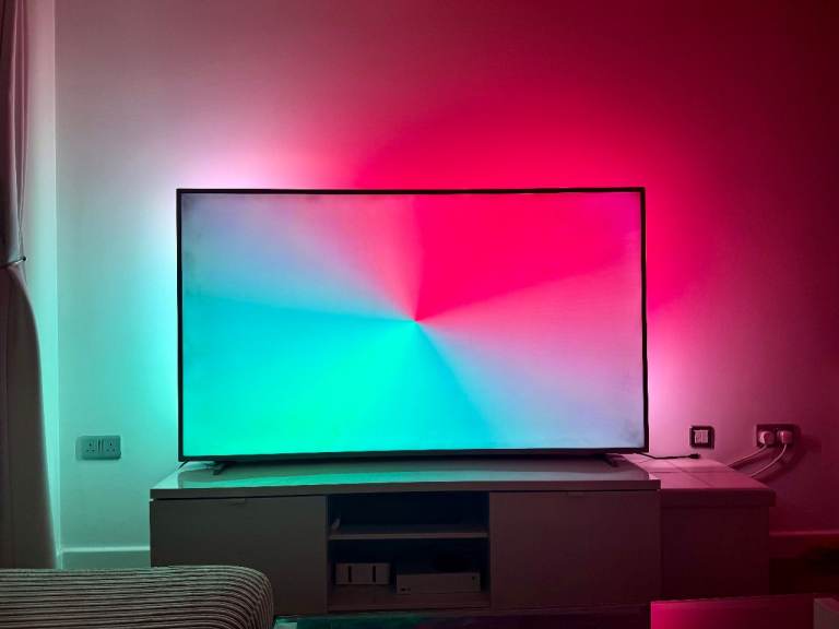 The picture quality is sharp and vibrant, and the 3-sided Ambilight genuinely makes a difference — especially in the evenings. It extends the colours onto the wall behind the TV and makes the screen feel even larger.