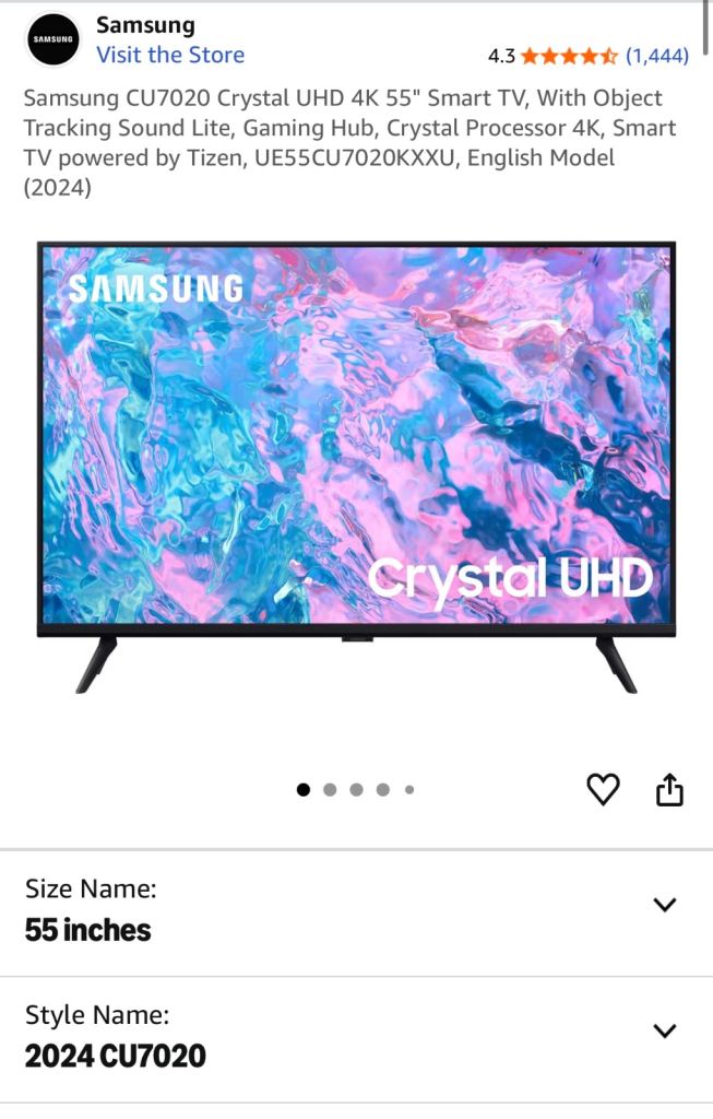 Posting for 9+ yearsSamsung 55″ Crystal UHD 4K Smart TV (CU7020, 2024) – Perfect Condition