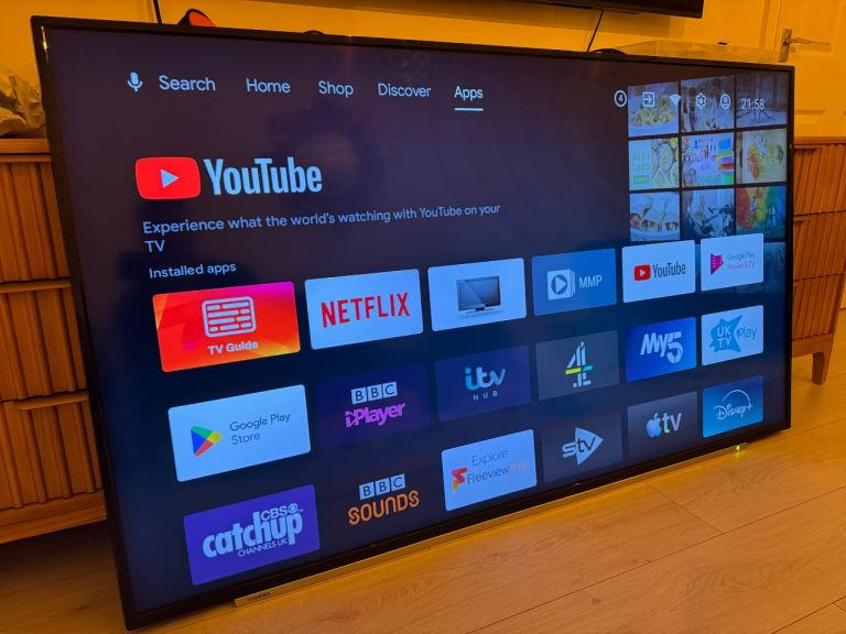 Work’s without faults, has any app as it’s android , chromecast,Bluetooth, voice commands and more, picture and sound is brilliant, comes with remote , NO stand , can be purchased a stand for around £12 or can be wall mounted, can be delivered or collected any questions pls ask, thank you 🙂