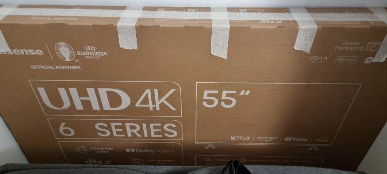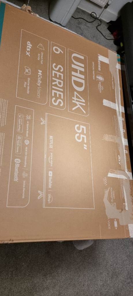Selling a **Hisense 55A6KTUK 55-inch 4K UHD Smart TV (2023/2024 model)** in excellent condition. The TV has only been used for around a week and has been safely stored in its original box ever since. It was recently unboxed only to take photos and a video.