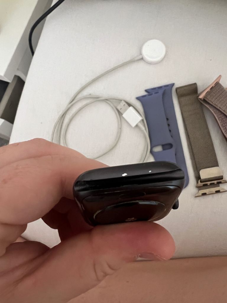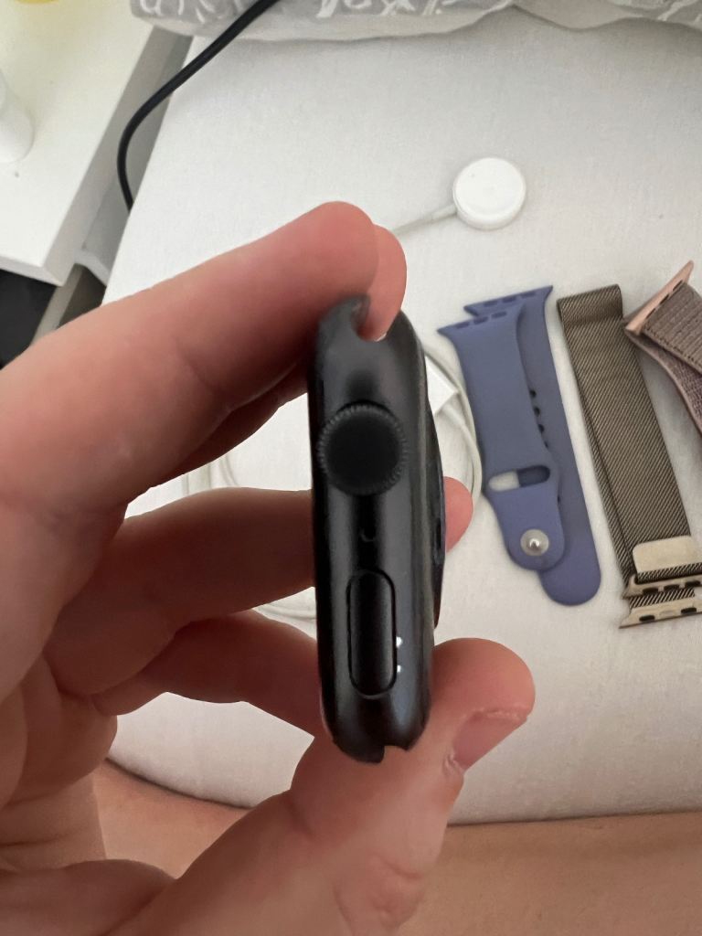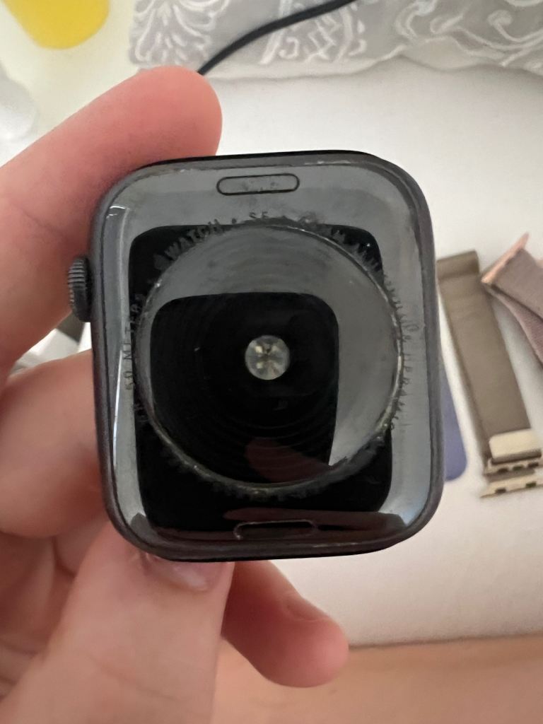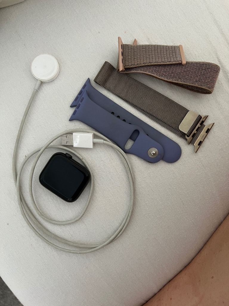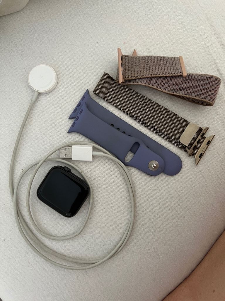 Selling my Apple Watch SE 44mm Space Grey GPS model with minor cosmetic scratches on the hardware. Comes with the original charging cable, an official Apple silicone strap, an official Apple gold metal strap (retail around £100), and an off-brand pink strap. All straps are in good condition.
