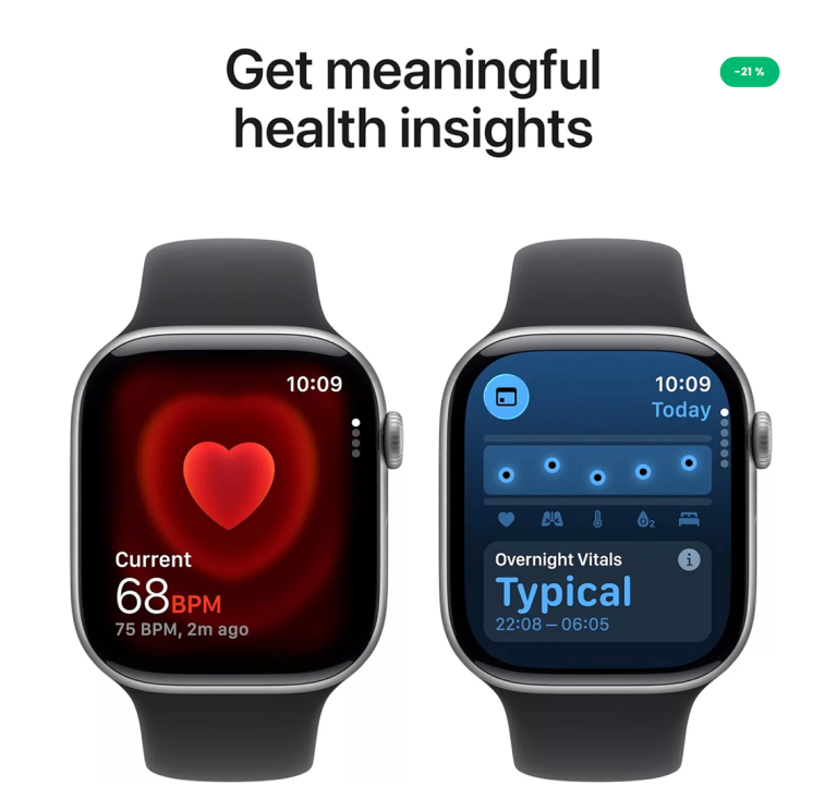 EVEN MORE HEALTH INSIGHTS — Take an ECG anytime. Get notifications for a high and low heart rate, an irregular rhythm and possible sleep apnoea. View overnight health metrics with the Vitals app and take readings of your blood oxygen.