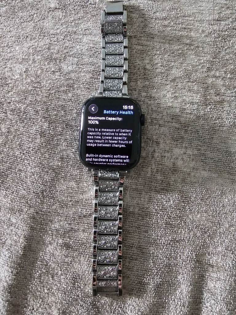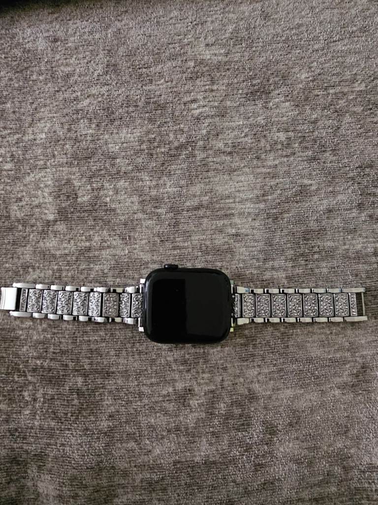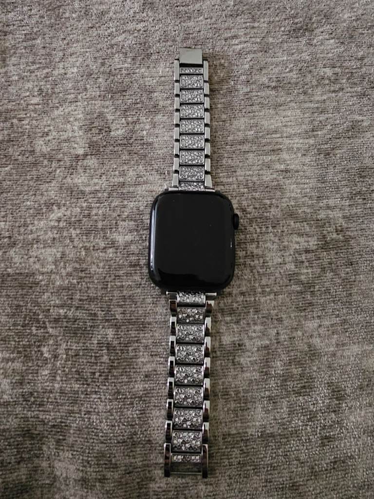 Apple Watch Series 8 GPS, 45mm, Midnight Aluminium, in excellent condition, comes with beautiful diamanté silver strap as well as a plain black strap. Charger included.
