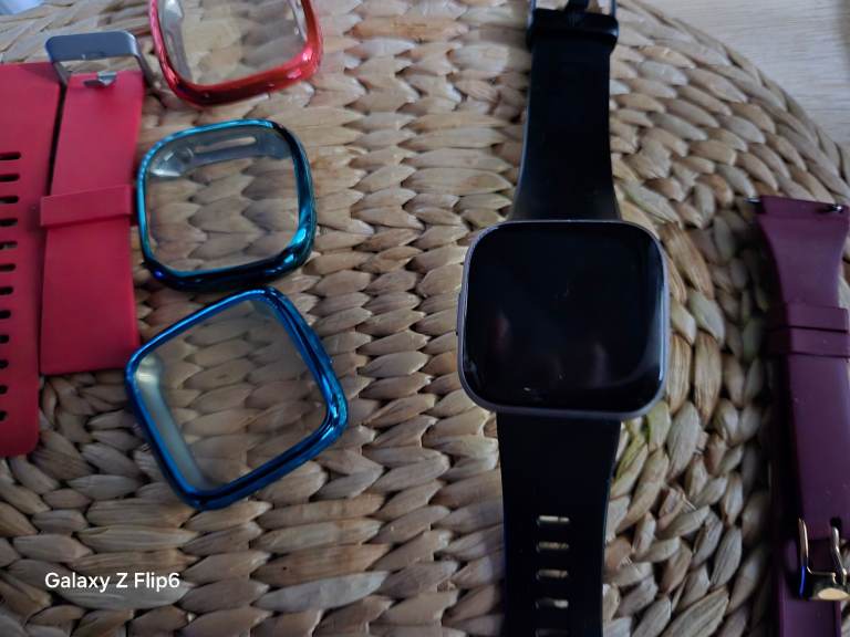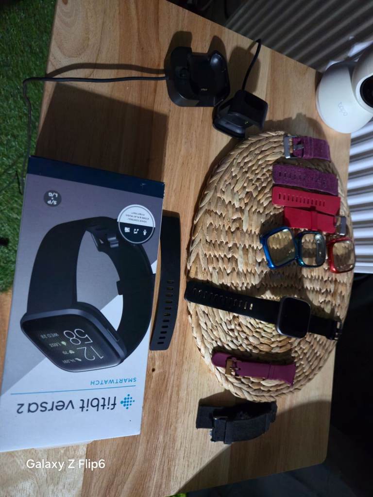 fitbit versa 2 in good condition apart from tiny scratch can't see when lit up has two chargers one for with case on and one for without case comes with box original original charger and original stripes battery last 5 days