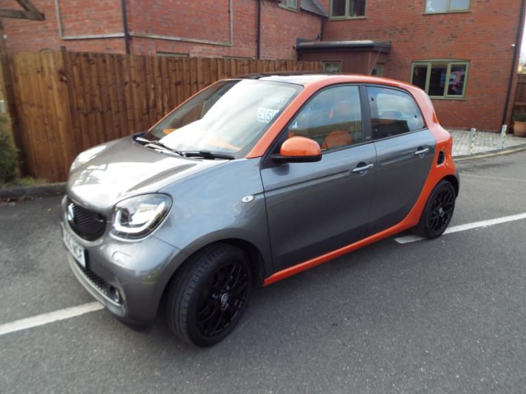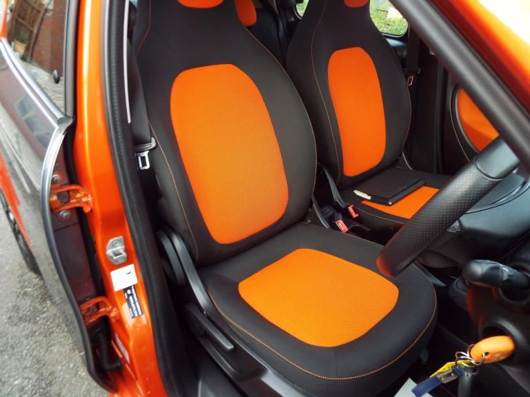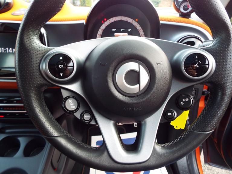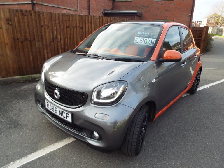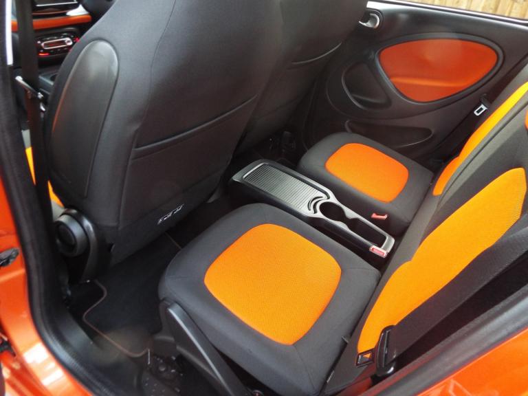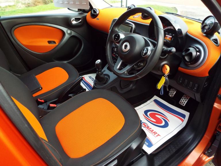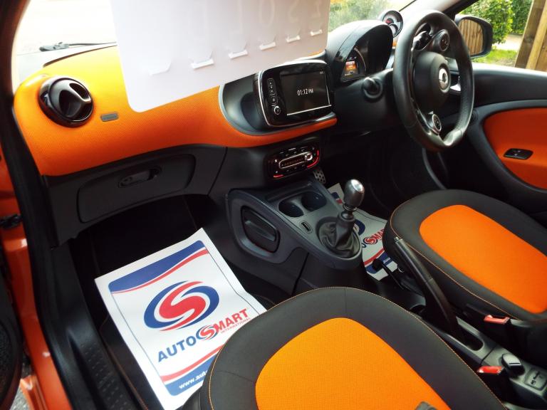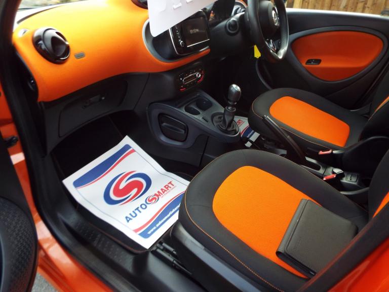 SMART FORFOUR 0.9 Turbo Edition Edition 1 5dr, SERVICE RECORDS @ 13K, 19K, 21K, 23K, 27K, 39K AND 43K, SAT NAV, ALLOYS, AIRCON, 2 REMOTE KEYS, SUNROOF, GREAT COLOUR COMBO, LOW INSURANCE/ ROAD TAX, BUY WITH CONFIDENCE FROM BRANT ROAD MOTOR CENTRE HAVING BEEN SELLING VEHICLES FROM OUR CURRENT LOCATION SINCE 1998, PROUD WINNER OF THE HIGHLY RATED AUTOTRADER DEALER AWARD WITH 5 STAR CUSTOMER REVIEWS, PLEASE CALL IN ADVANCE TO BOOK AN APPOINTMENT, PART EXCHANGE/ FINANCE AVAILABLE, 3 point seatbelts, Crash sensor (Auto hazards on), Driver and passenger airbags, Driver and passenger seatbelts with warning light, Driver/front passenger side airbags, Drivers knee airbag, Front seat belt height adjuster, Seat belt force limiter, Seat belt tensioners, Tyre pressure monitoring system, Alarm/immobiliser, Automatic door locking, Remote central locking, Remote locking fuel filler flap, Anti lock brake system with Brake Assist, Electronic Stability Programme, Hill start assist, Lowered suspension, Electric adjustable heated door mirrors, Automatic intermittent rear wash/wipe, Electric front windows, Heated rear window with timer, Rain and light sensors, Black radiator grille, Body coloured bumpers, Bodypanels in metallic paint, Chrome exhaust tailpipe, Panoramic glass roof with sunblind, Rear spoiler, TRIDION safety cell in lava orange, Coming home function, Front fog lights, LED daytime running lights, LED tail lights, Partial LED headlights, White side indicators, 2 rear head restraints, 50/50 split folding rear seat backrest, Front head restraints, Height adjustable driver's seat, Isofix attachments on outer rear seats, Velour floormats, Ambient lighting, Front reading lights, Luggage compartment lighting, Driver/passenger sunvisors with ticket holders + vanity mirrors, 12V socket with cover, 2 cupholders, 3 Spoke leather multi function steering wheel, Brushed stainless steel sports pedals with rubber studs, Centre console storage tray, Chrome inner door handles, Cloth upholstery, Dashboard and door centre panel in orange fabric and black highlights, Front door storage bins, Front passenger grab handle, Height adjustable steering wheel, Leather gear knob, Load lashing points, Lockable glovebox, Luggage compartment cover, Storage box under rear seat, Sunglasses holder, Through load facility, Automatic climate control, Crosswind Assist, Cruise control with speedtronic variable speed limiter, Rear park assist, Rear view camera, Speed sensitive variable power assisted steering, Cockpit clock and rev counter, Instrument cluster with display, On board computer, Outside temperature display, Service interval indicator, Smart media navigation with 7"" touch screen, Bluetooth interface for hands free telephone, Voice control system, Bluetooth audio streaming, Smart audio system with aux/USB interface, 16"" 8 Y spoke alloy wheels painted in black, Breakdown kit