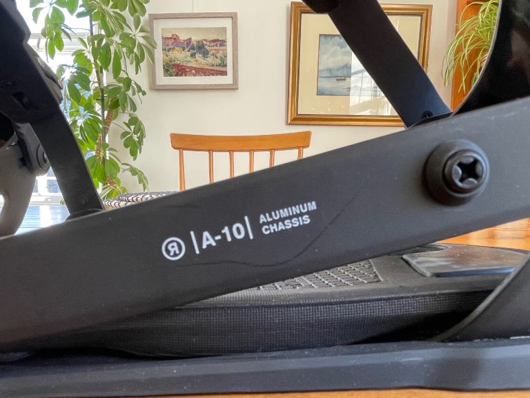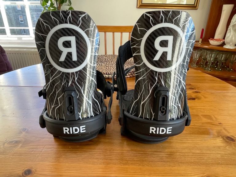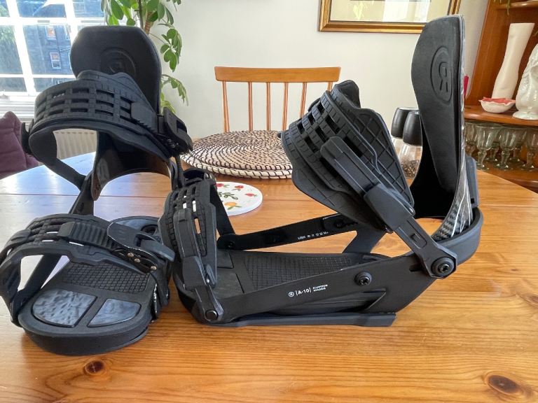 Ride A-10 snowboard bindings - size large - very good condition, one superficial nick to one upper binding. Includes all original mounting pucks (plastic and metal).