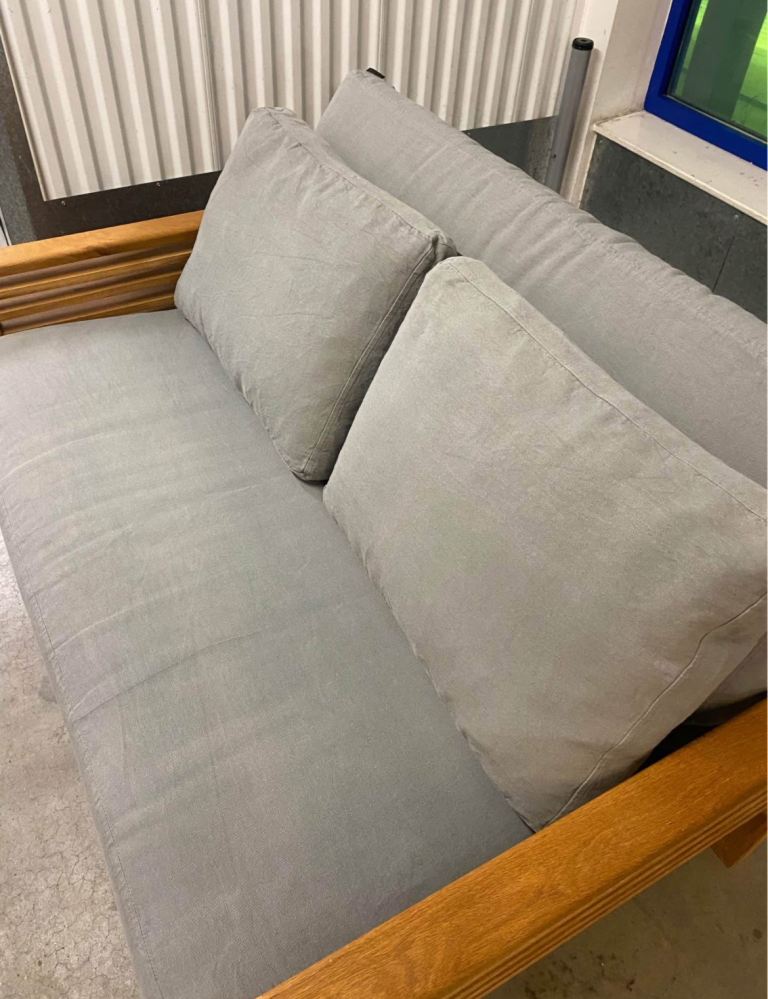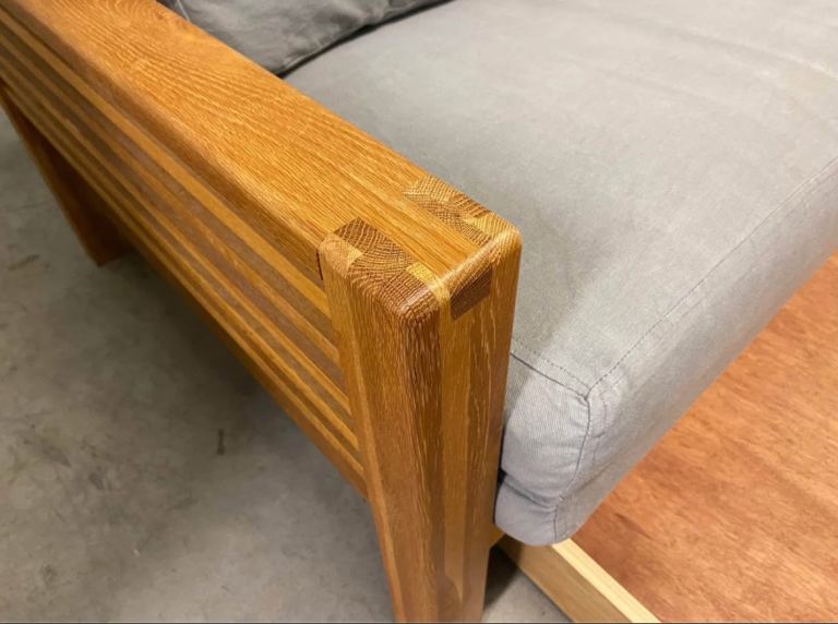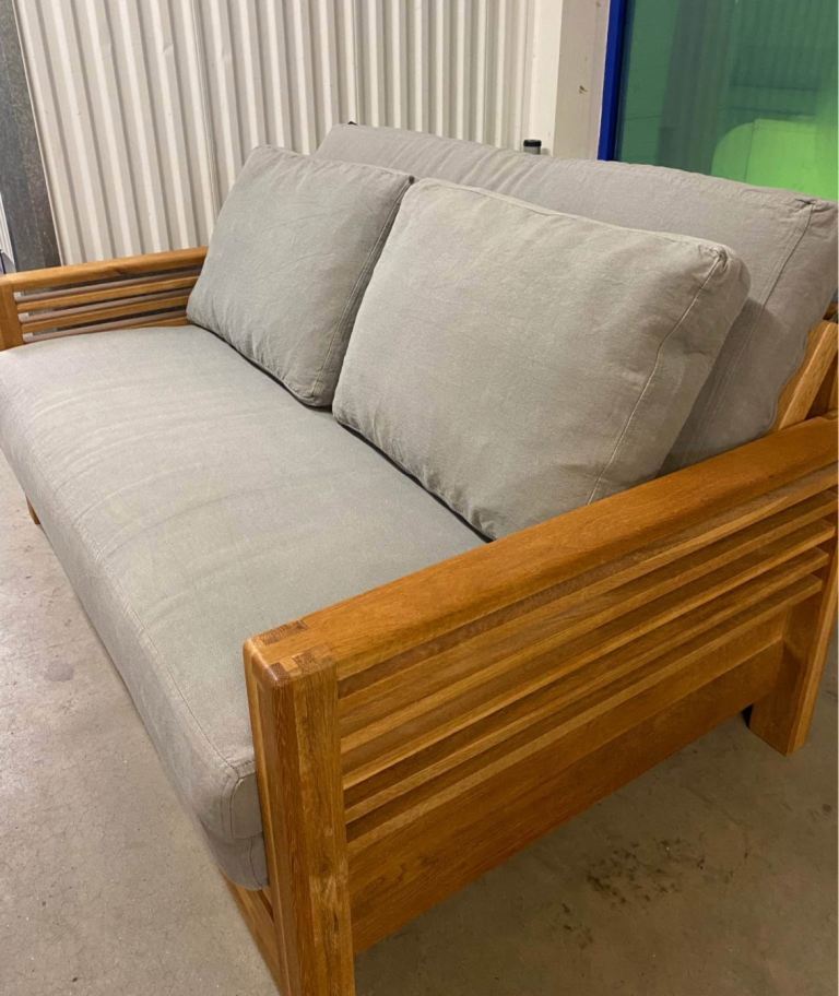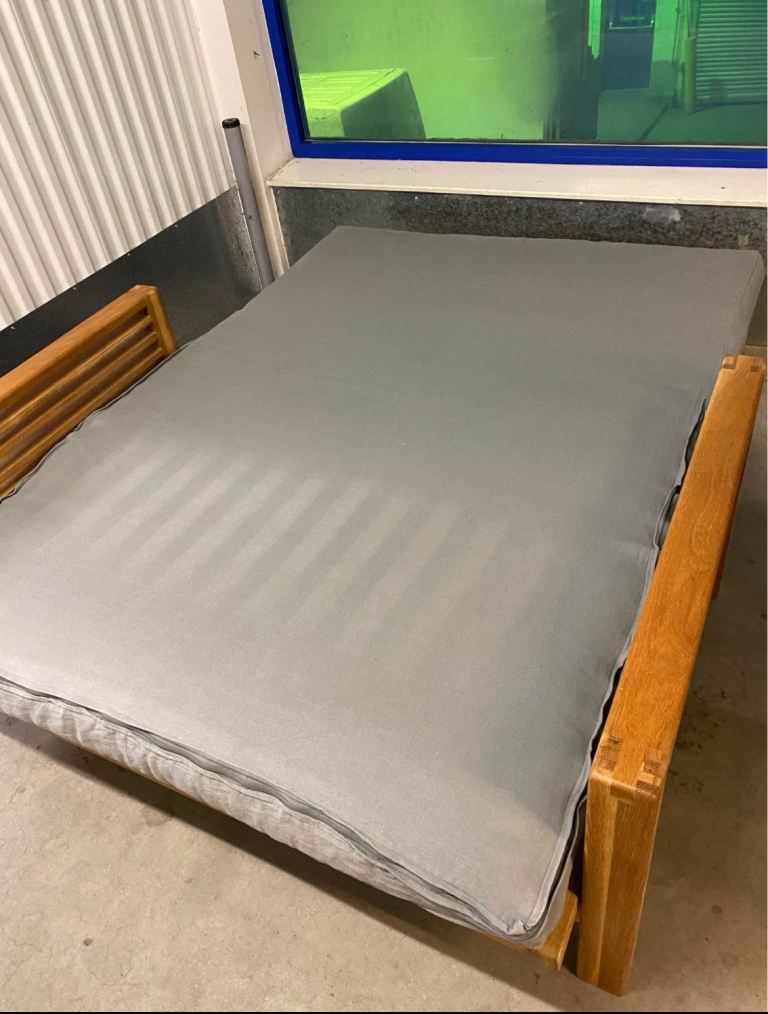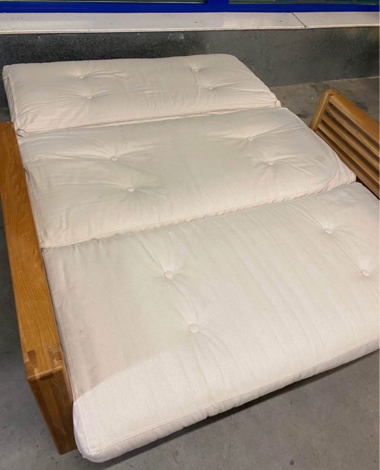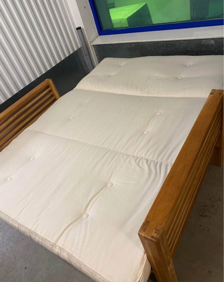 Exceptional quality fully solid oak frame, so heavy and substantial! Comes with the upgraded 3 panel mattress and grey machine washable cover plus the matching back cushions and under storage drawer which all costed more.