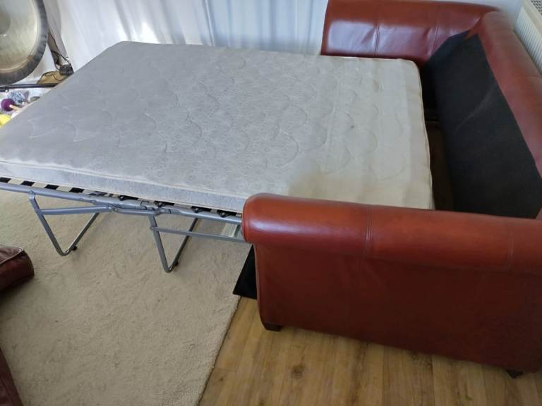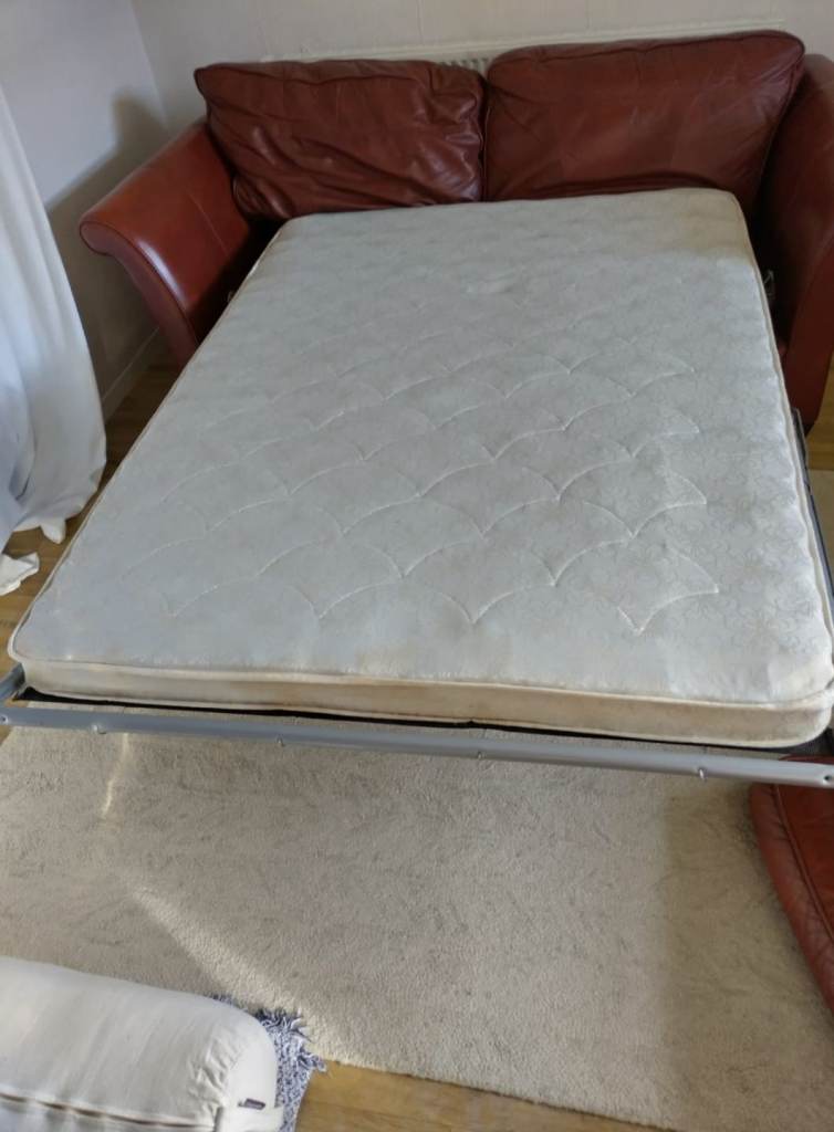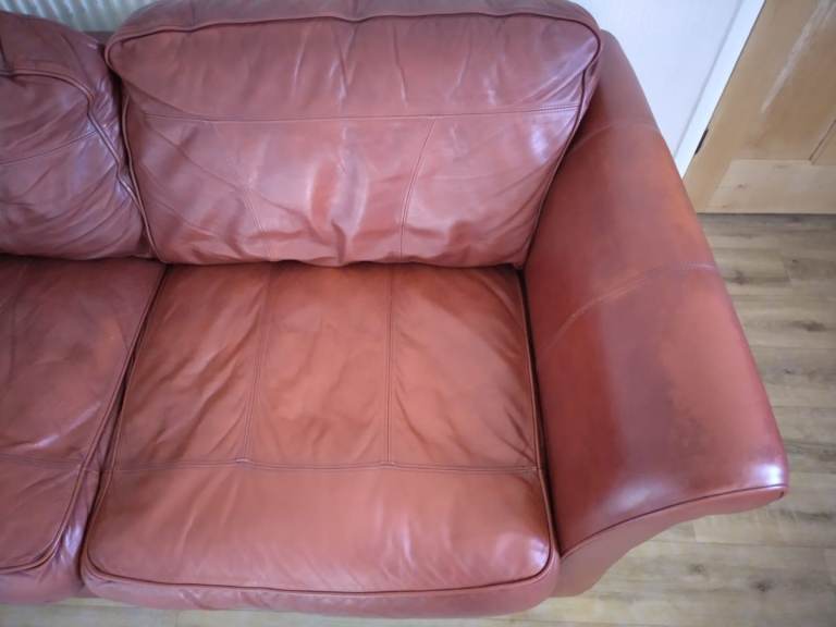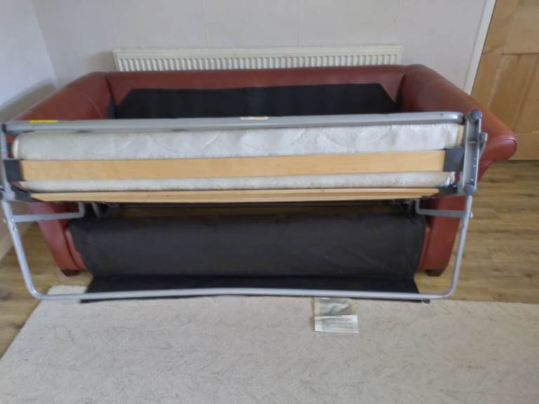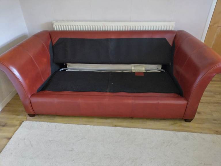 A very high quality and much loved 3 seater (with two very large seater cushions) DFS sofa-bed in beautiful maroon leather. About 10 years old, but very well looked after, with no significant marks or damage.