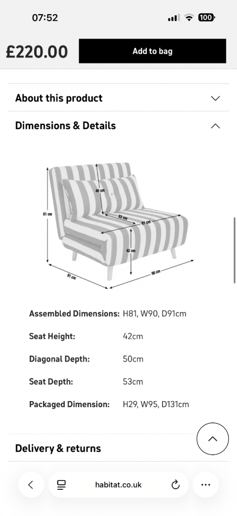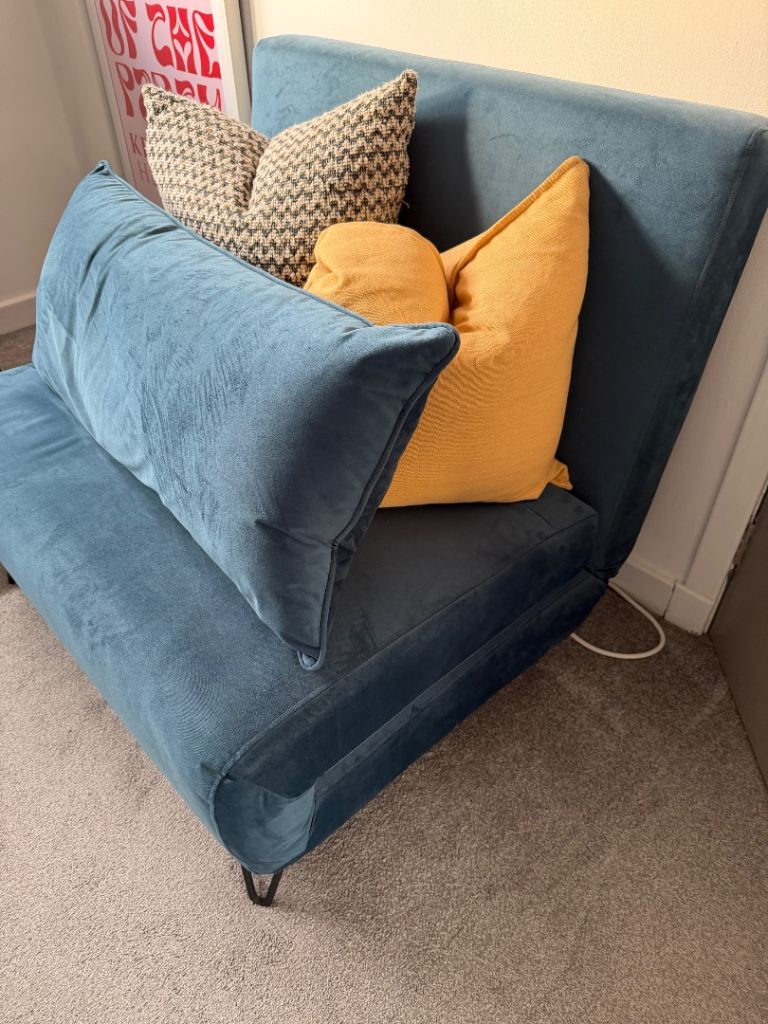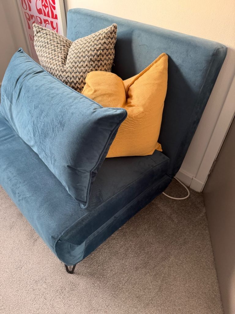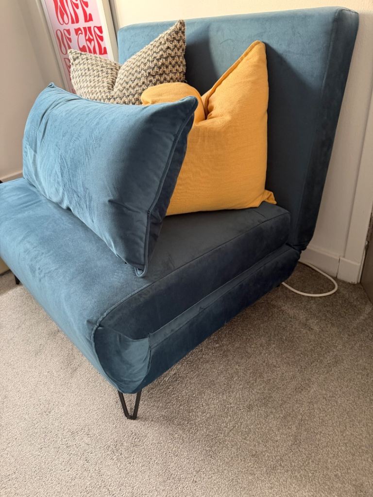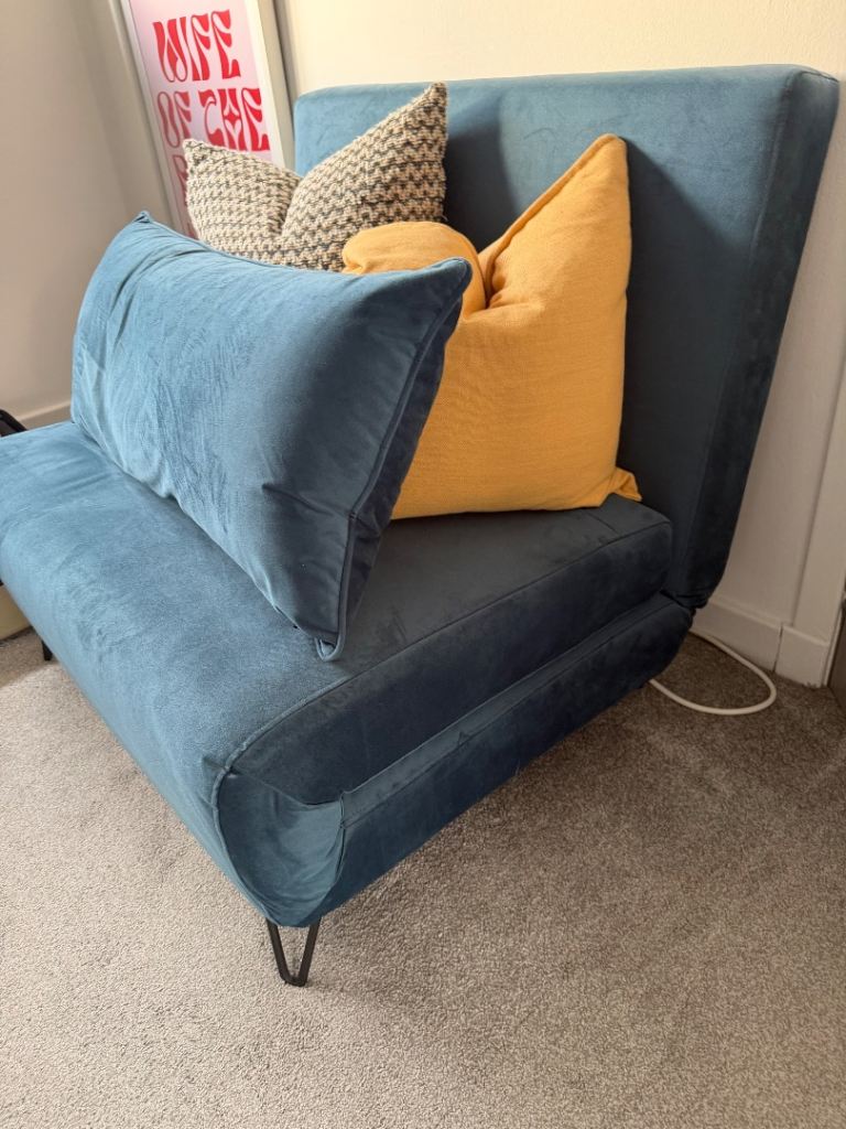 Habitat single sofa bed used 3 times in excellent condition its a blue velvet material. Cushions on top are included. Current models selling for £220