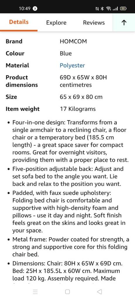 Four-in-one design: Transforms from a single armchair to a reclining chair, a floor chair or a temporary bed (185.5 cm length) - a great space saver for compact rooms. Great for overnight visitors, providing them with a proper place to rest