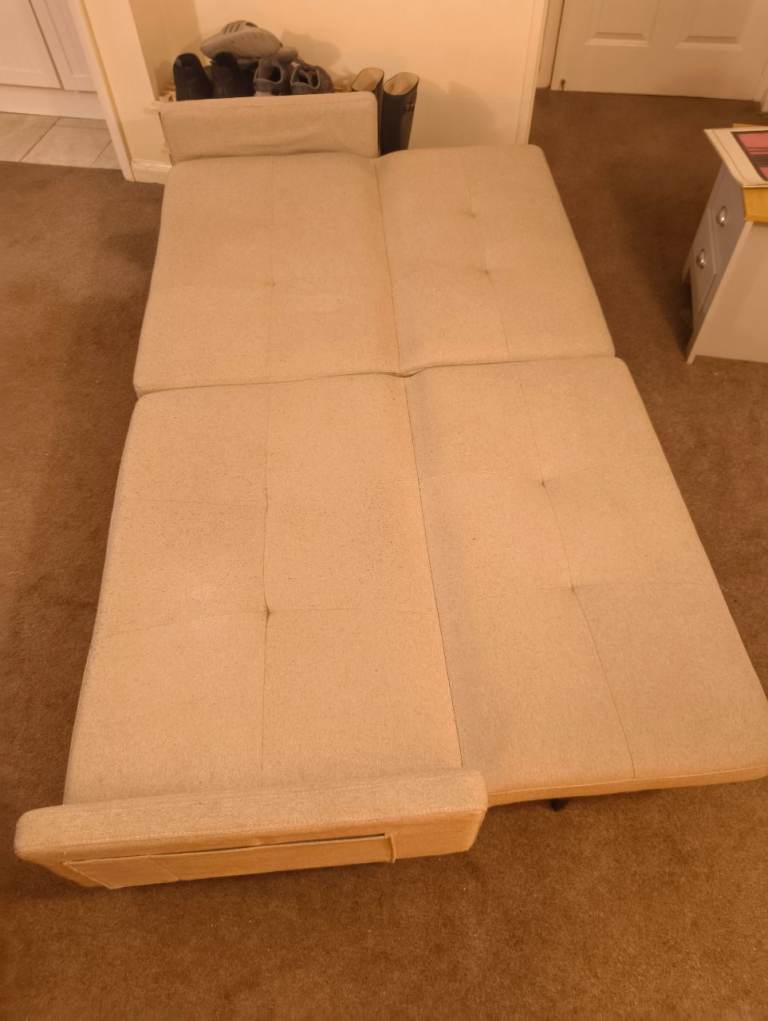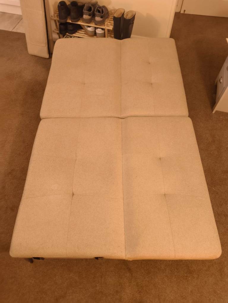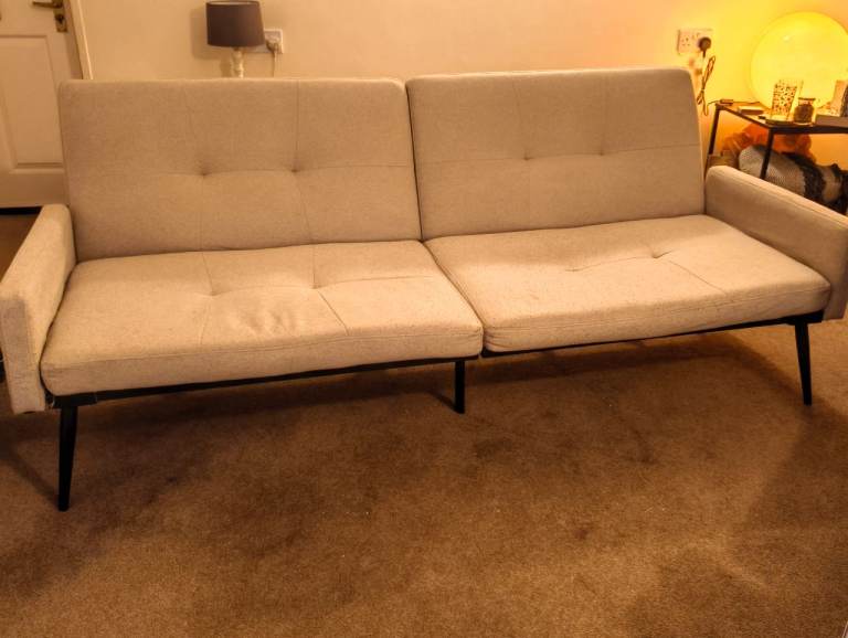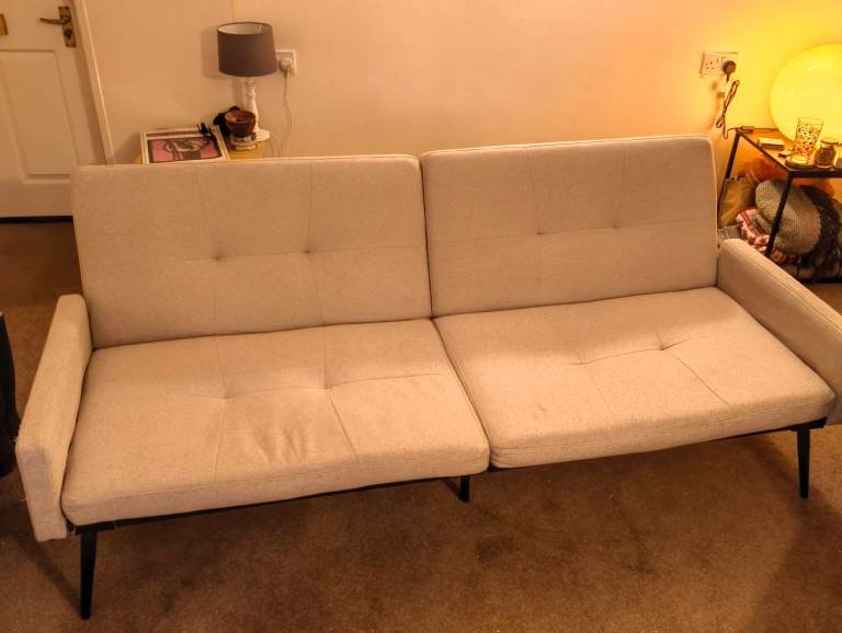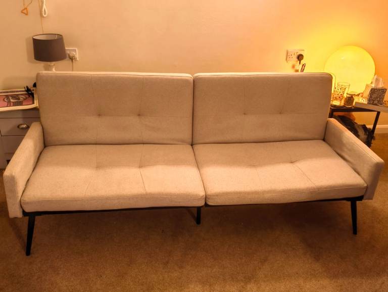 BEIGE - Click Clack Sofa bed, seats 3, converts into double bed - using click clack feature. Back rests can also be adjusted to different angles.