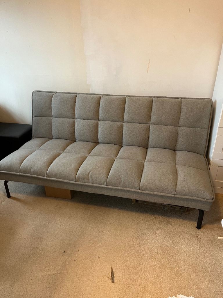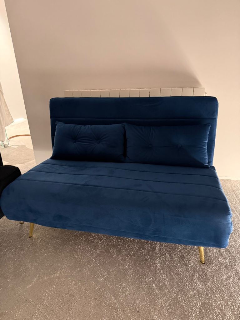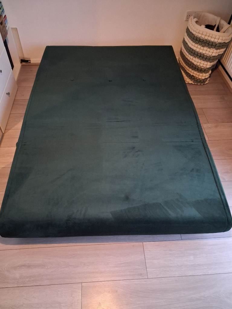 Dark green velvet click clack sofa bed. 180 x 122 as bed. New. Button missing off one cushion.